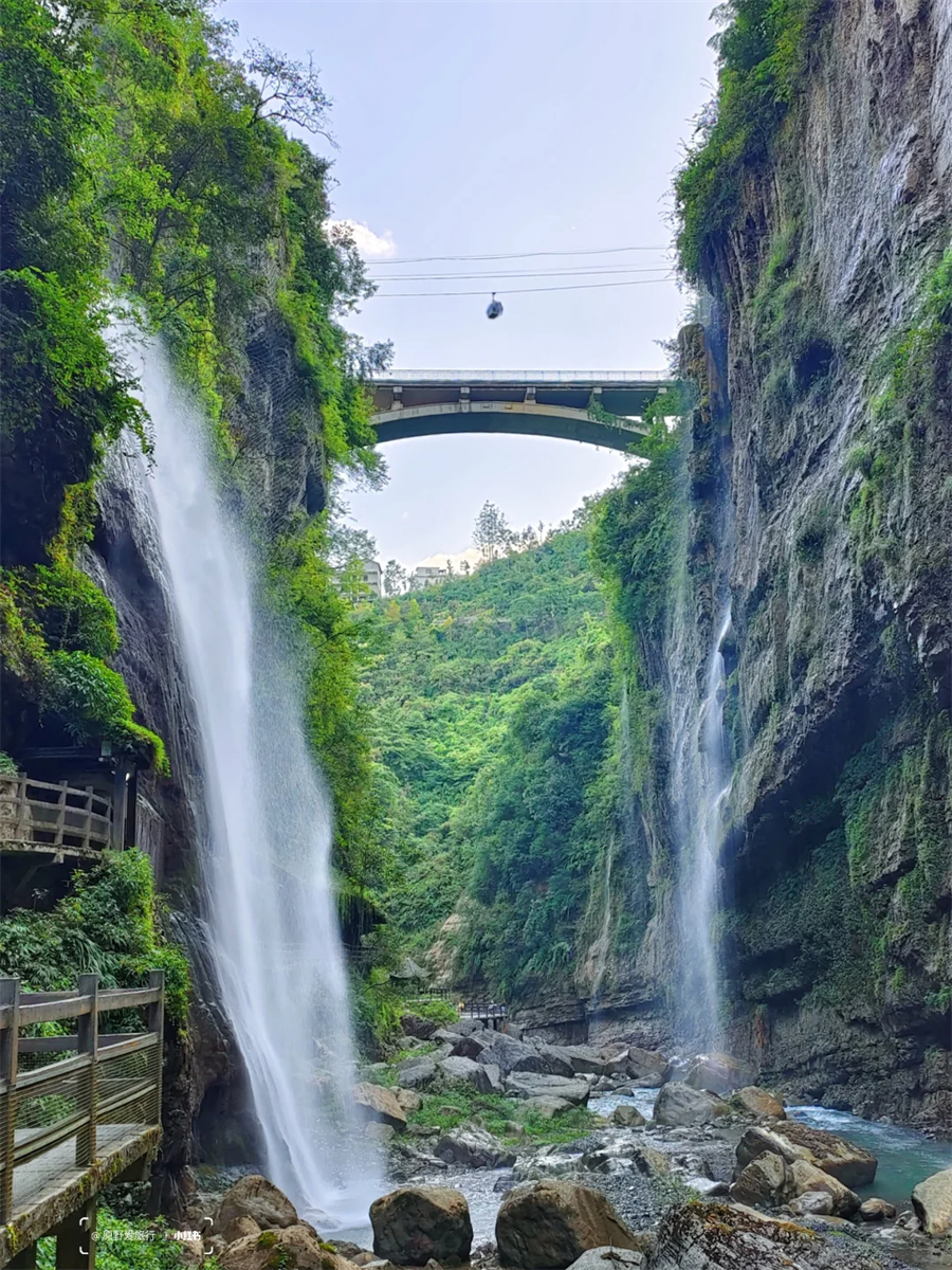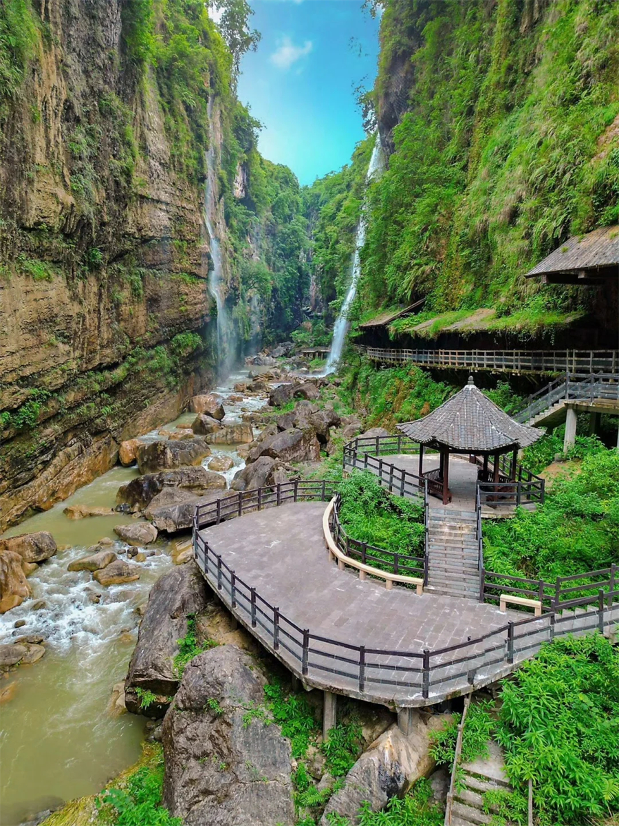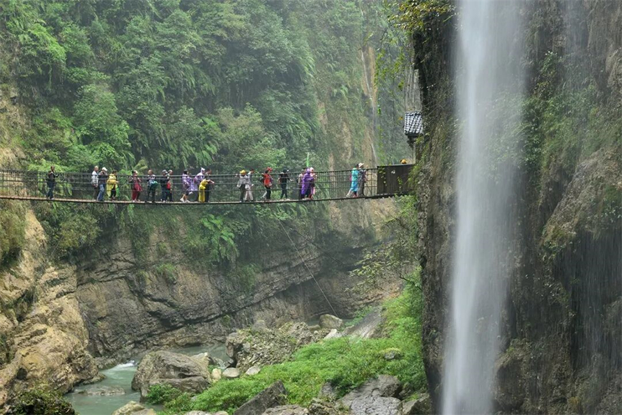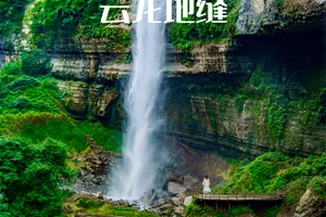 云龙地缝峡谷中有百里绝壁、千丈瀑布、原始森林、远古村寨等,是夏季避暑休闲的好地方。在景区内你可以下到深达百米的地缝中,也可以行走在300米高处的悬空栈道上,享受与众不同的刺激感。