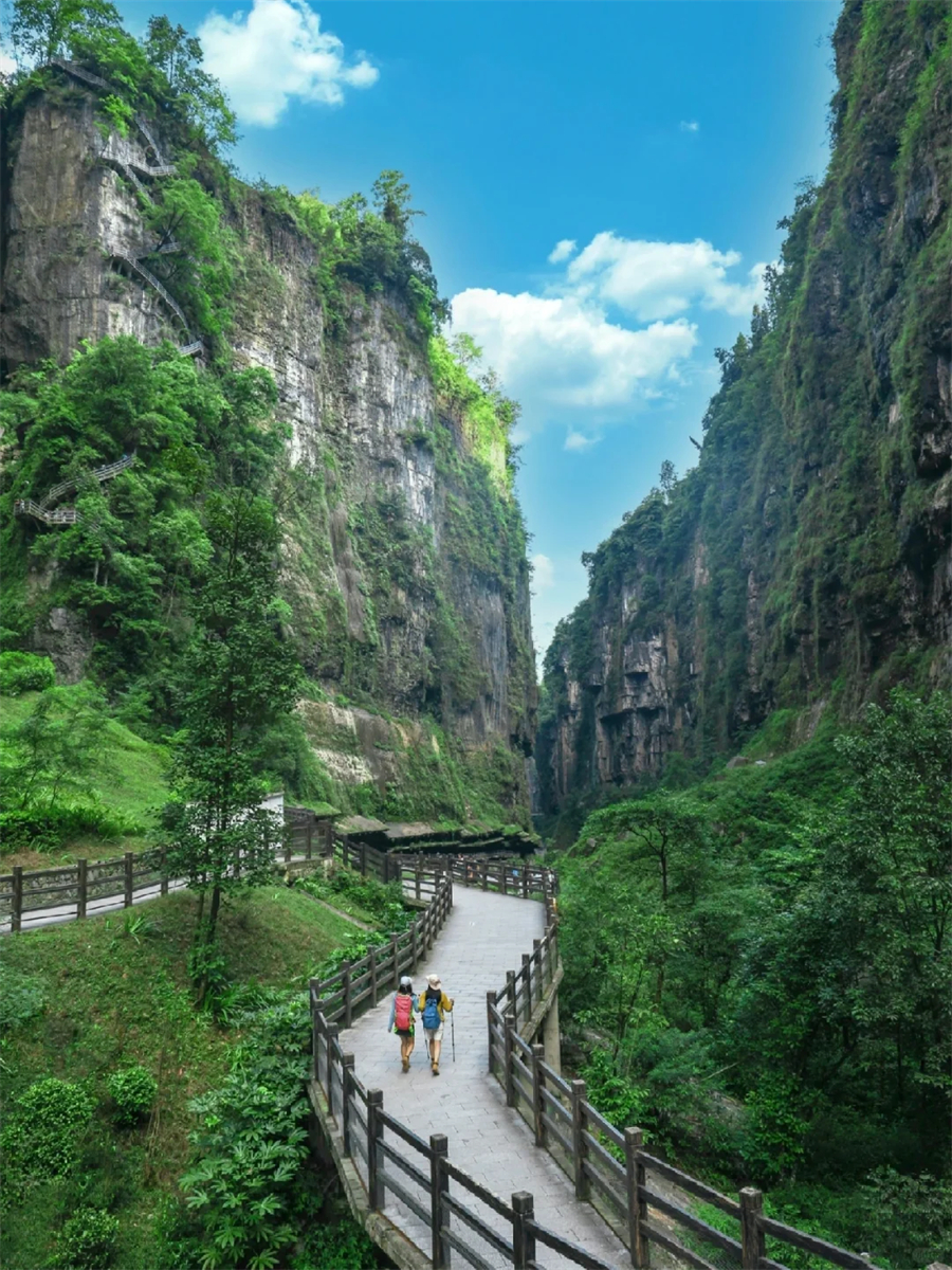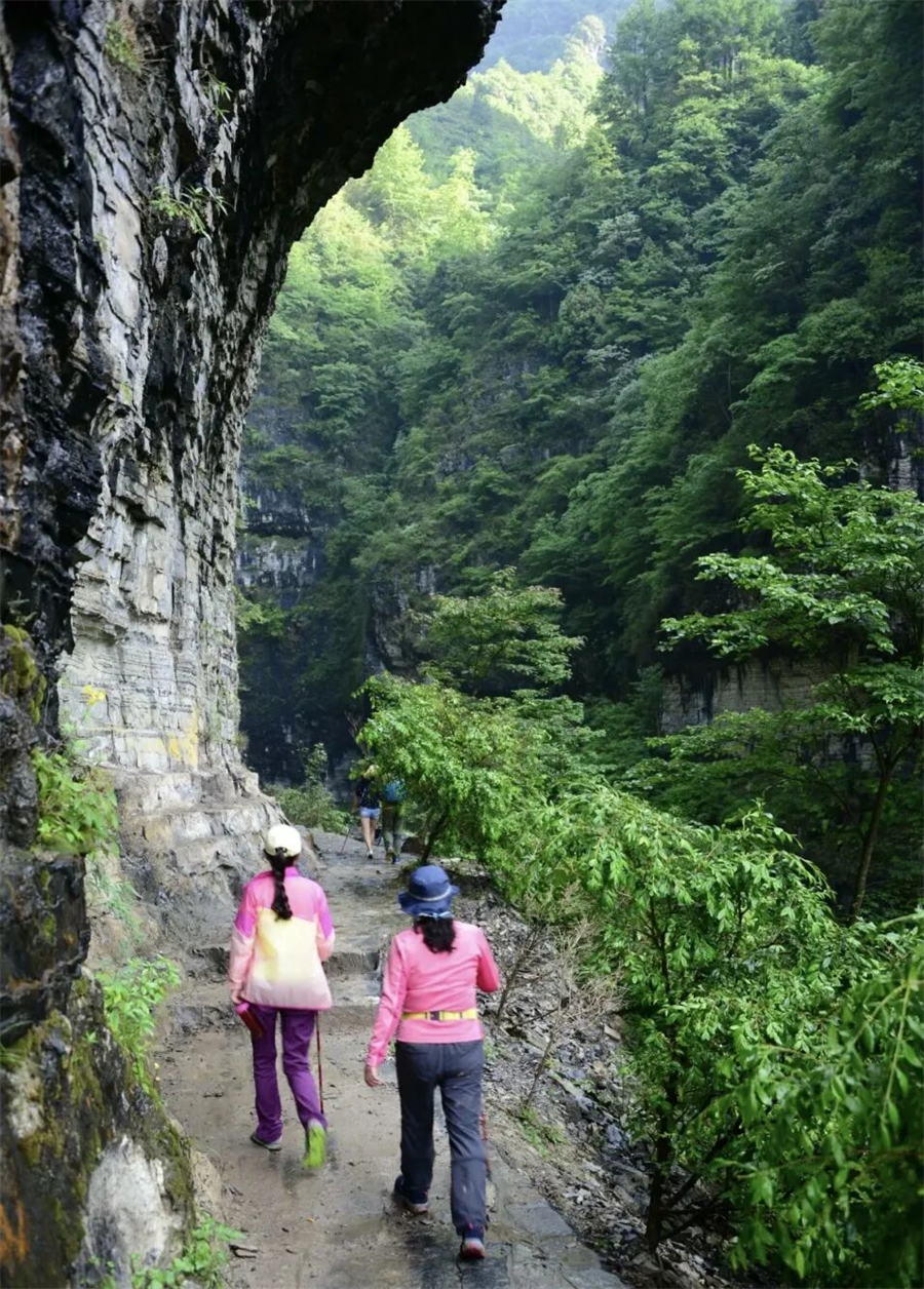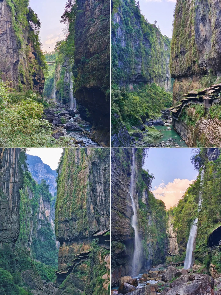 峡谷中的百里绝壁、千丈瀑布、傲啸独峰、原始森林、远古村寨等景点美不胜收。游览大峡谷最开始的一段路是最难的,石阶陡而长,一根登山杖可以为你节省不少体力。绝壁栈道是整个峡谷最精华的部分,全长488m,118个台阶,位于海拔1700m、净高差300m之绝壁山腰间,行走其间“步步惊心”,步步是景。