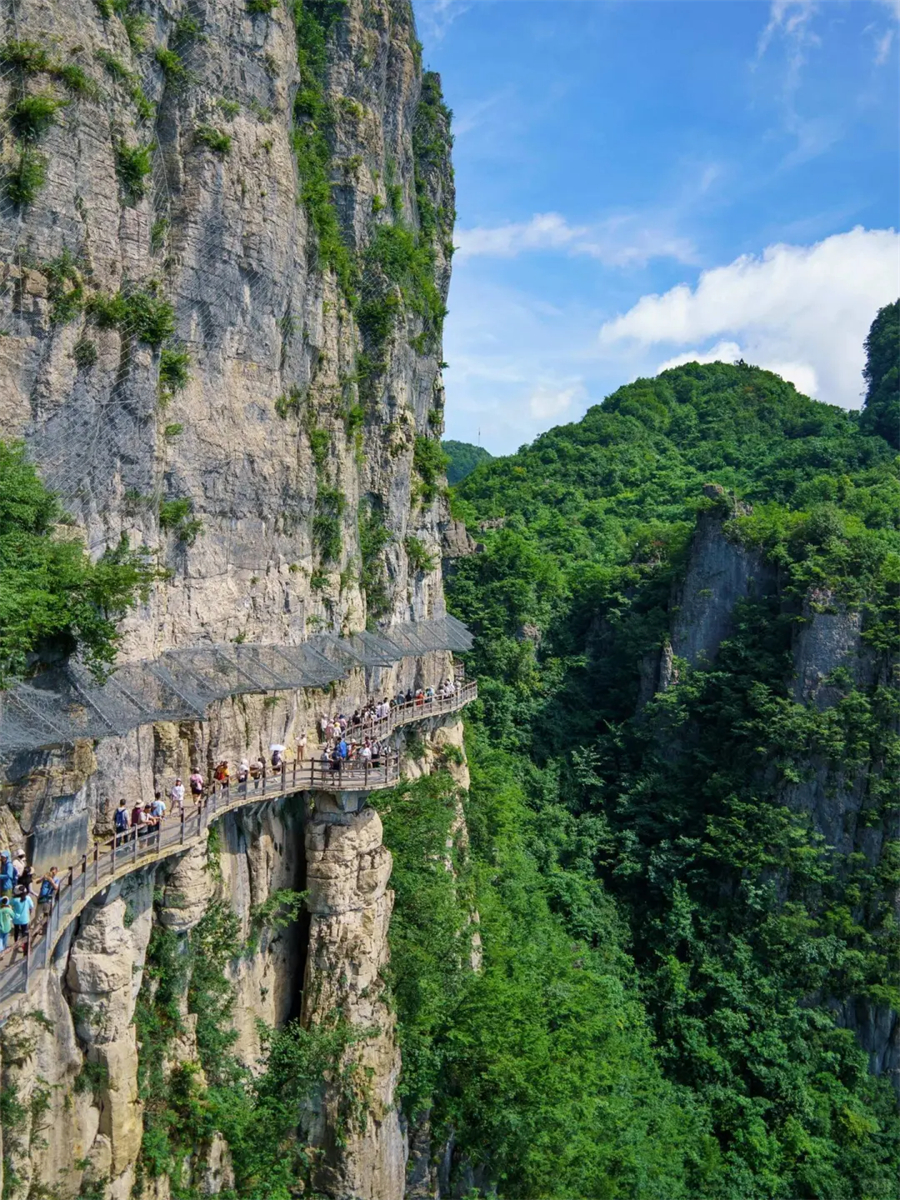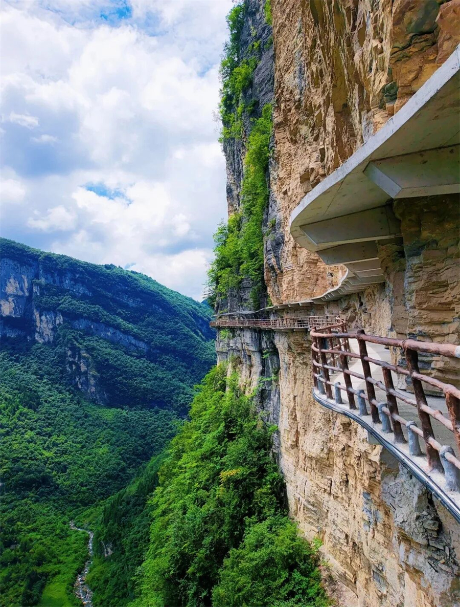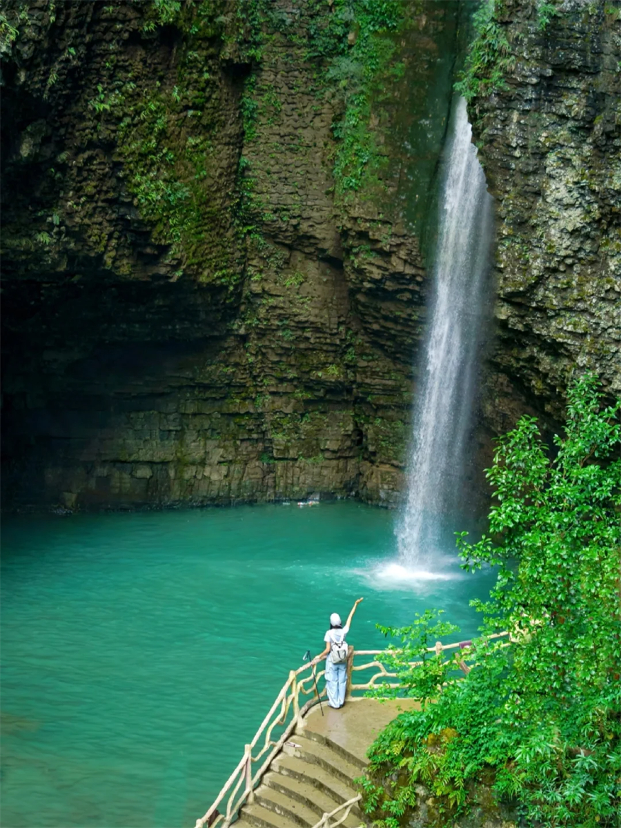 峡谷中的百里绝壁、千丈瀑布、傲啸独峰、原始森林、远古村寨等景点美不胜收。游览大峡谷最开始的一段路是最难的,石阶陡而长,一根登山杖可以为你节省不少体力。绝壁栈道是整个峡谷最精华的部分,全长488m,118个台阶,位于海拔1700m、净高差300m之绝壁山腰间,行走其间“步步惊心”,步步是景。