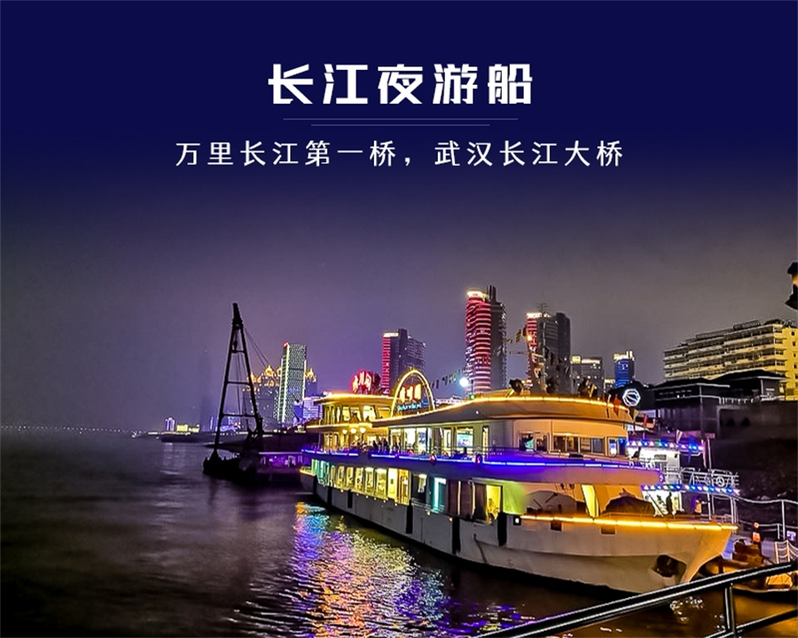 你也可以选择【长江夜游船】长江是游客来到武汉不可或缺的一站。乘坐游船行驶于江面上,可以将长江大桥、江滩、黄鹤楼等两岸风光尽收眼底,夜游景色更佳。船上还提供中餐、西餐、自助餐等服务。