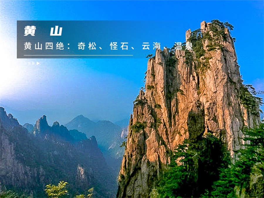 奇景:黄山有五绝三瀑,五绝为:奇松、怪石、云海、温泉、冬雪;三瀑为:人字瀑、百丈泉、九龙瀑。