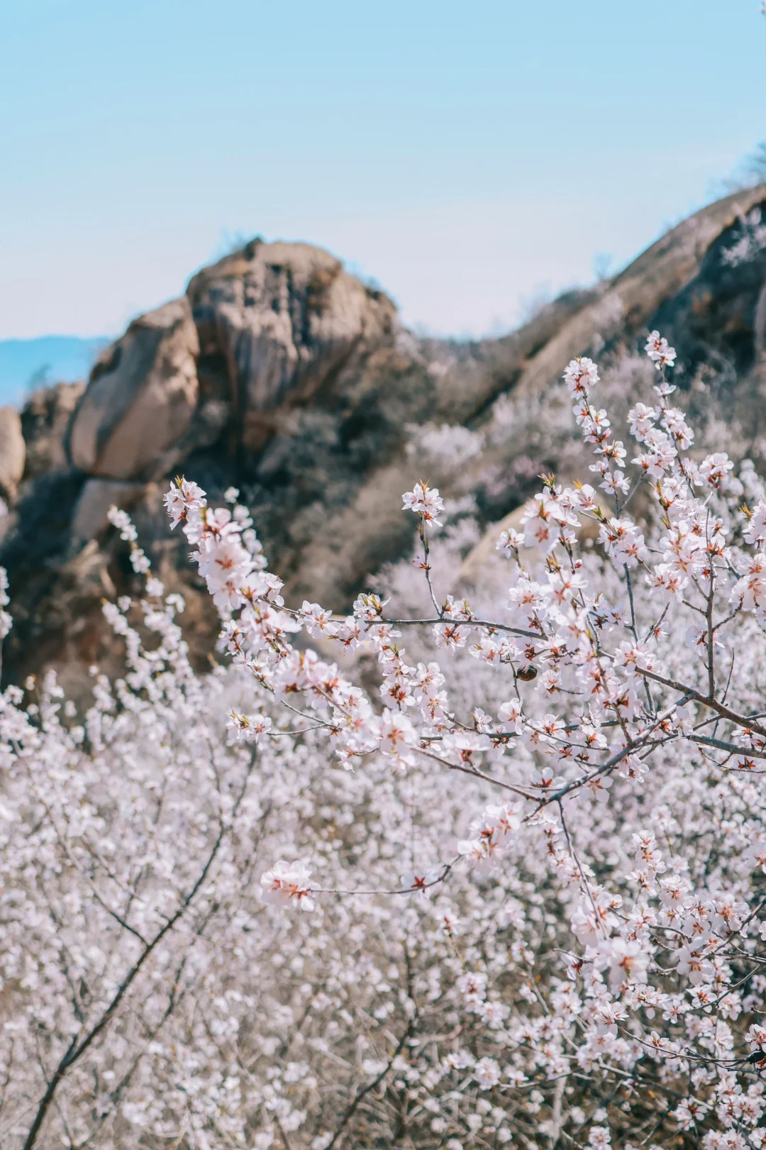 每到春天就会变成粉红色的海洋,大多数植物还没有来得及抽芽,漫山遍野的桃花铺满山坡,不夹杂着一点其它颜色。白虎涧的桃花全是野生的,依山而上蜿蜒起伏,开得肆意而绚烂,与陡峭的山峰、湛蓝的蓝天构成了北京郊区最美的桃林春景画卷。