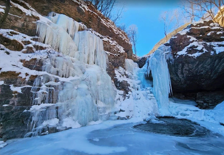 山谷深处,一道高10米、宽5米的冰面飘于崖边,像壮美的瀑布一样,冰瀑右下边的冰面已经被“撕破”,露出后面的凹型空洞,宛若花果山上的水帘洞。洞口的冰瀑珠帘玉垂如在开半帘的厚重帏幕帘,让洞里充满神秘感。近距离接触冰瀑,由上而下的流水冻结了各种姿态的冰瀑,非常震撼,两边黝黑的岩石衬托着冰瀑更加洁白迷人。