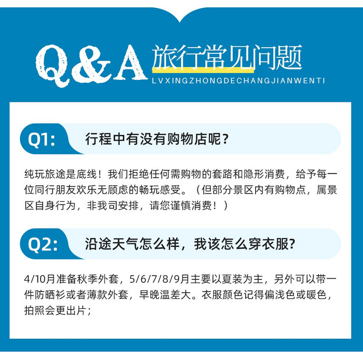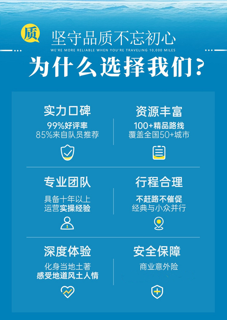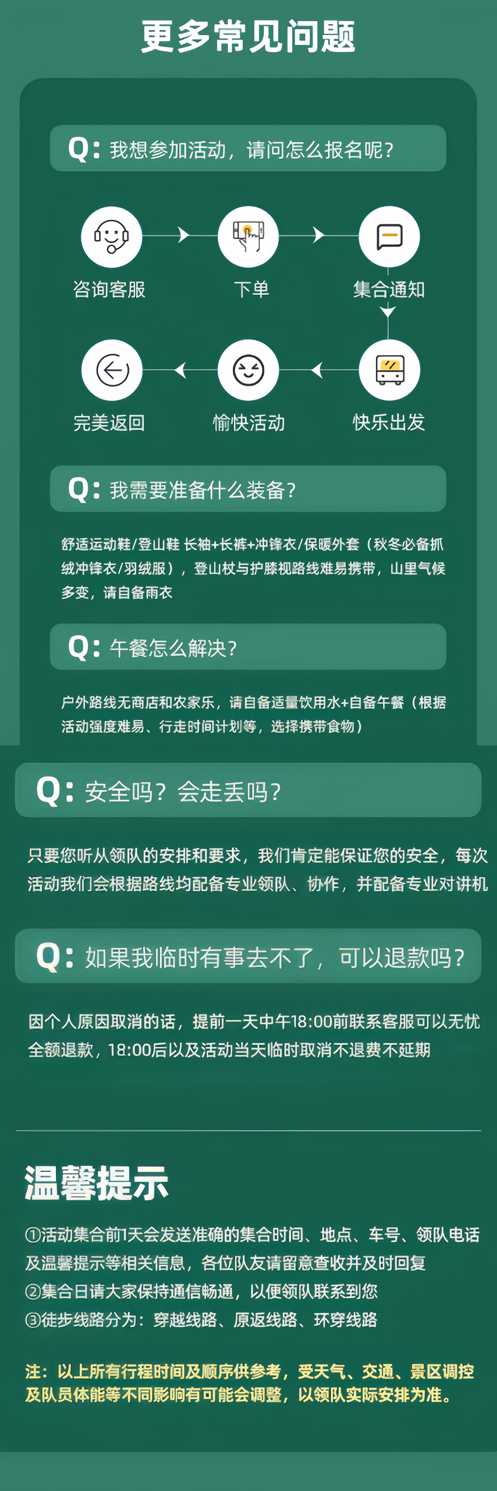 3、成团说明:如因参团人数未达到发团人数则取消当期活动,活动出行前提前通知并全额退款,积极为游客推荐类似路线或拼团。