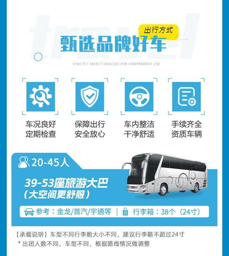 2、车上座位顺序为集合时先到的先坐,发车之后保持原车原座(有老年人、晕车等情况的领队将酌情调整);