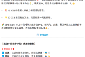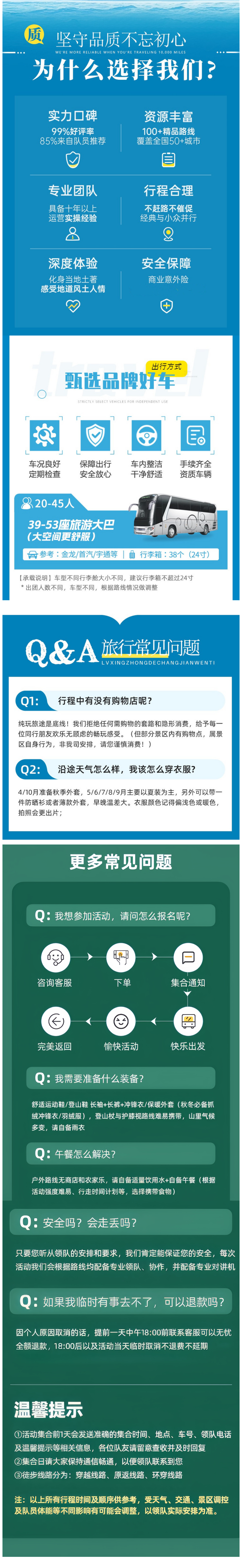 3、成团说明:如因参团人数未达到发团人数则取消当期活动,活动出行前提前通知并全额退款,积极为游客推荐类似路线或拼团。