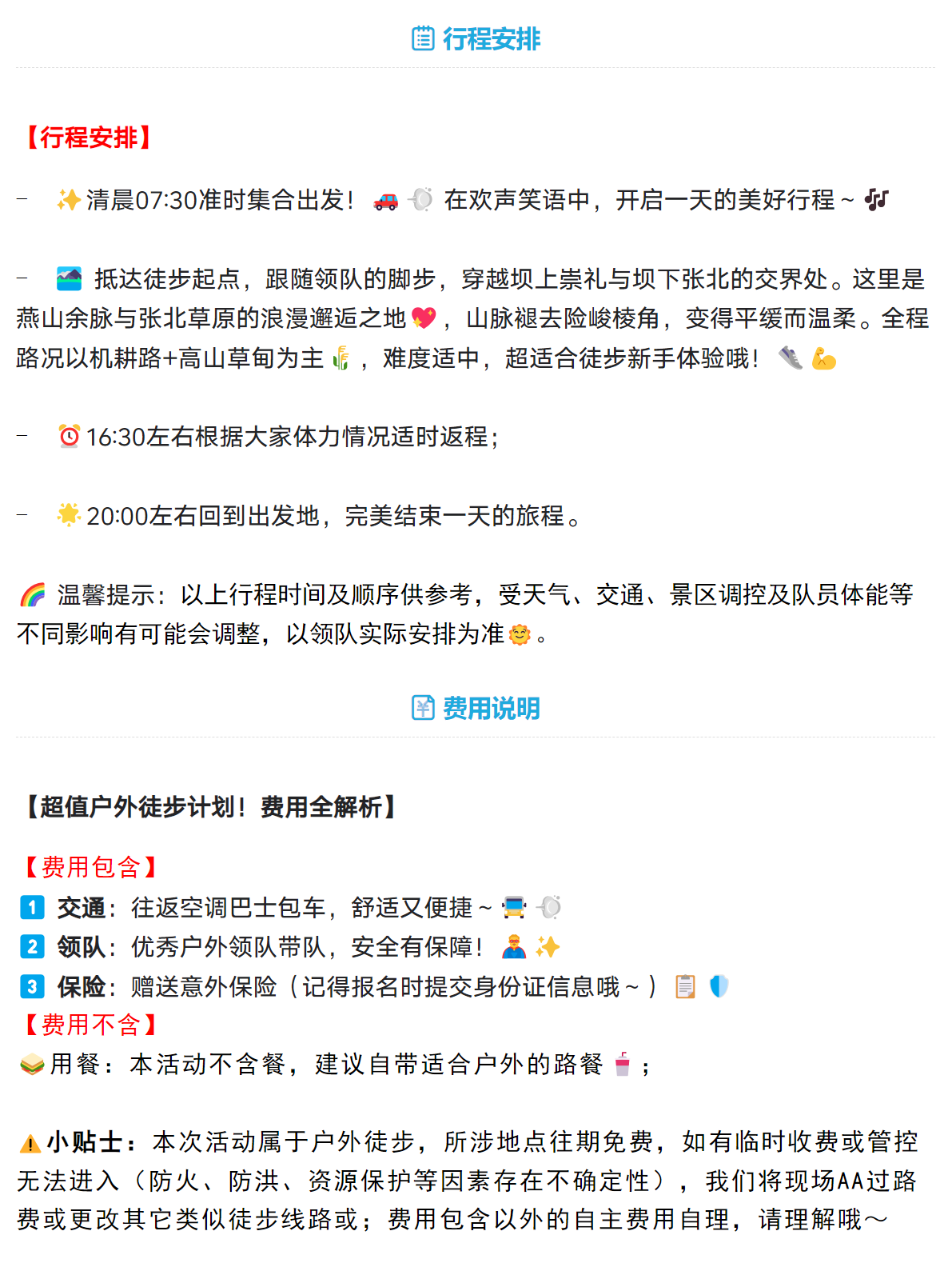 ⚠️小贴士:本次活动属于户外徒步,所涉地点往期免费,如有临时收费或管控无法进入(防火、防洪、资源保护等因素存在不确定性),我们将现场AA过路费或更改其它类似徒步线路或;费用包含以外的自主费用自理,请理解哦~