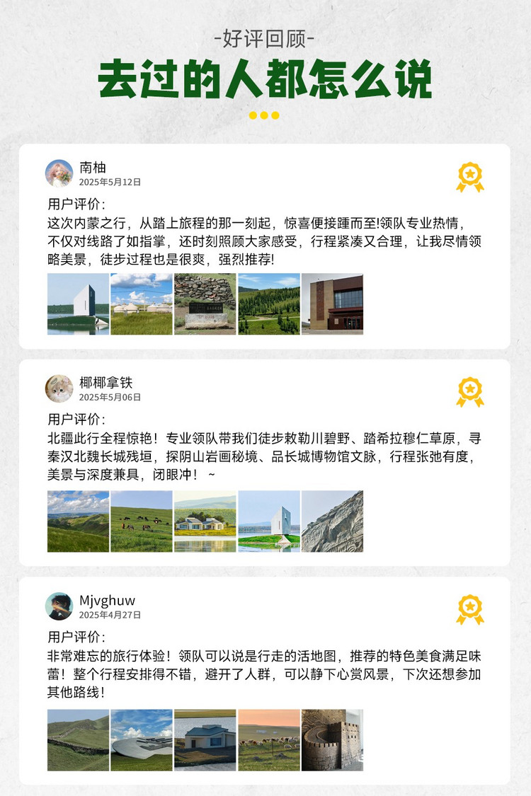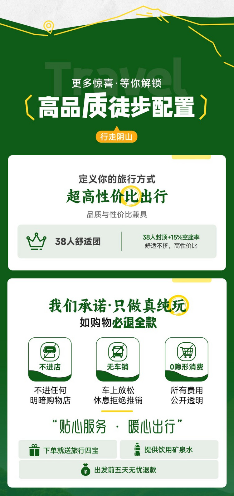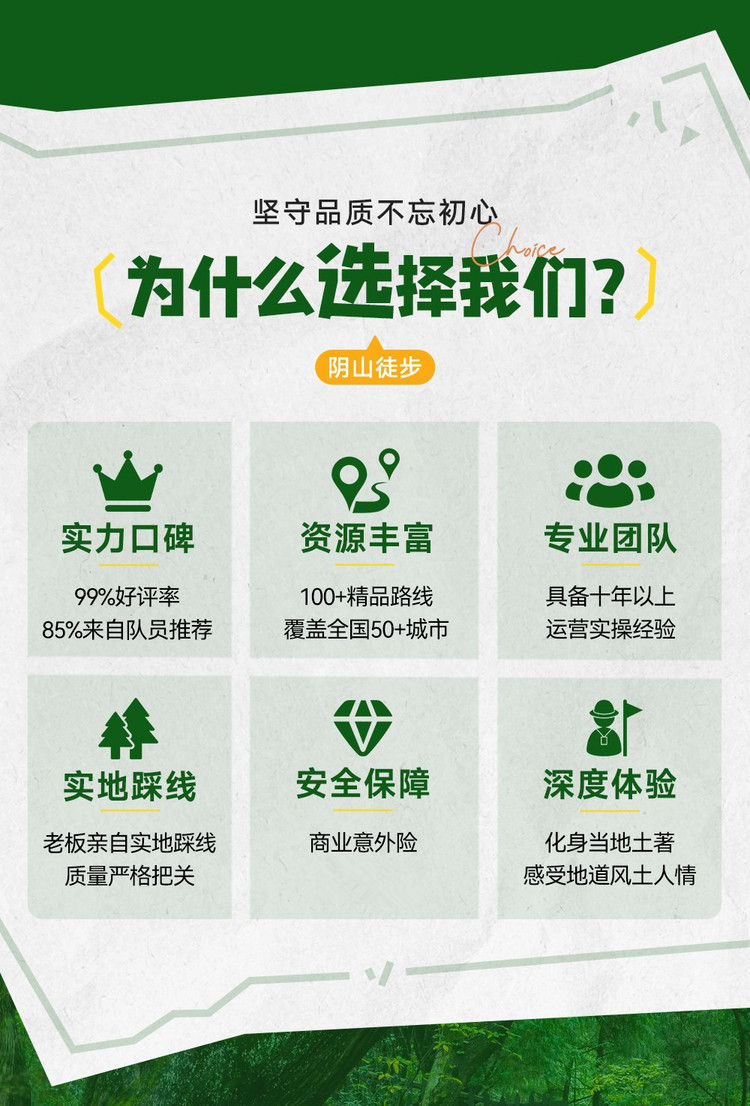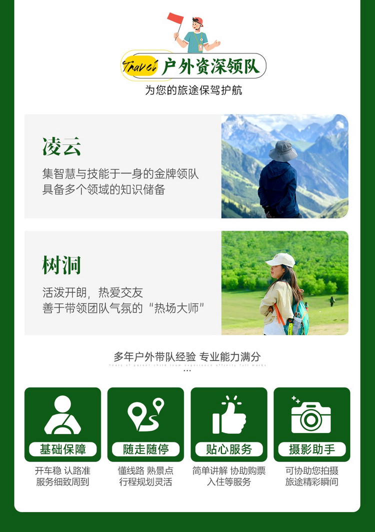 3、成团说明:如因参团人数未达到发团人数则取消当期活动,活动出行前提前通知并全额退款,积极为游客推荐类似路线或拼团。