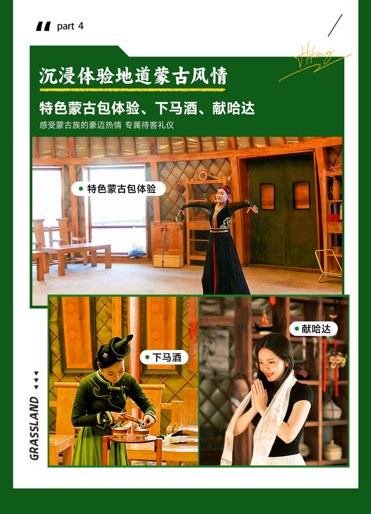 享用晚餐后,入住草原蒙古包,随后参加草原篝火晚会,围着熊熊篝火、学跳安代舞,在静谧的草原夜空下度过一个难忘的夜晚!