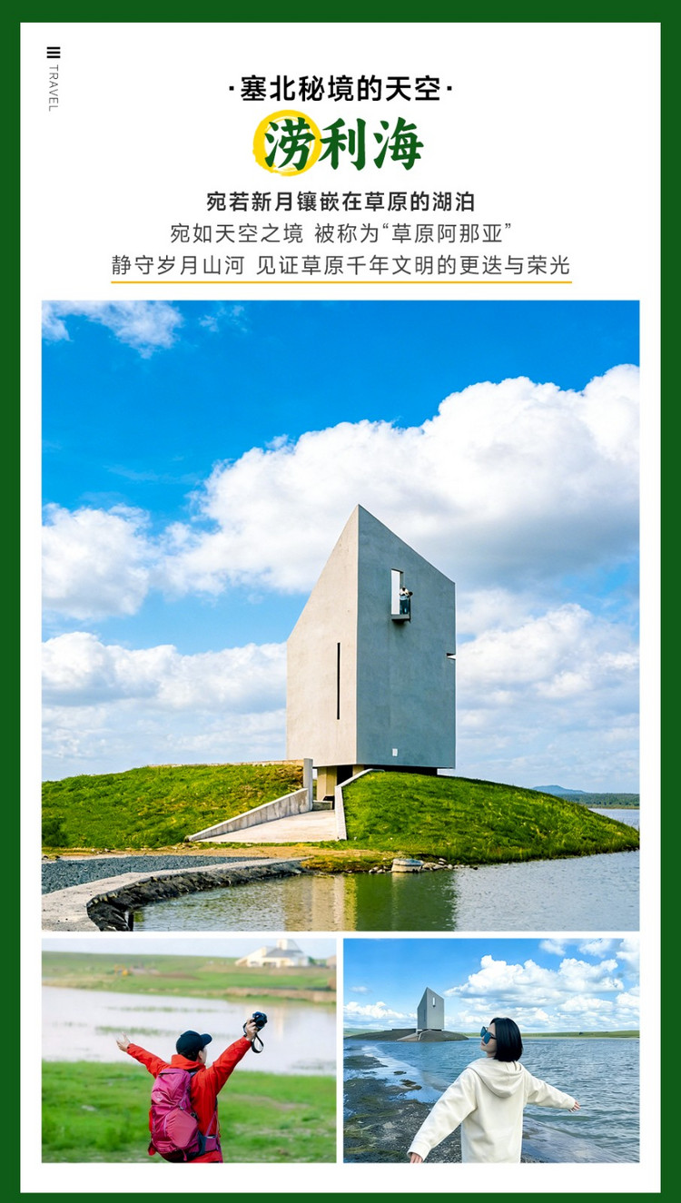 ·【涝利海】《再见爱人》的名场面拍摄地之一。一个椭圆形天然湖泊,湖东边是一望无际的林地和农田,西边是由沼泽和湿地构成的草滩,北面是辽阔的天然牧场。更值得一提的是,围绕涝利海打造了一个乡村旅游扶贫民宿项目,这里有了湿地上的教堂和草原上的飞船,给人一种草原中长出一片海的奇妙感觉。这里就是草原上的阿那亚,更贴近大自然,是在乡村中自然生长,而非人工创造,未被过分开发的纯粹。