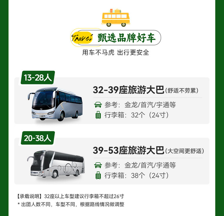2、车上座位顺序为集合时先到的先坐,发车之后保持原车原座(有老年人、晕车等情况的领队将酌情调整);