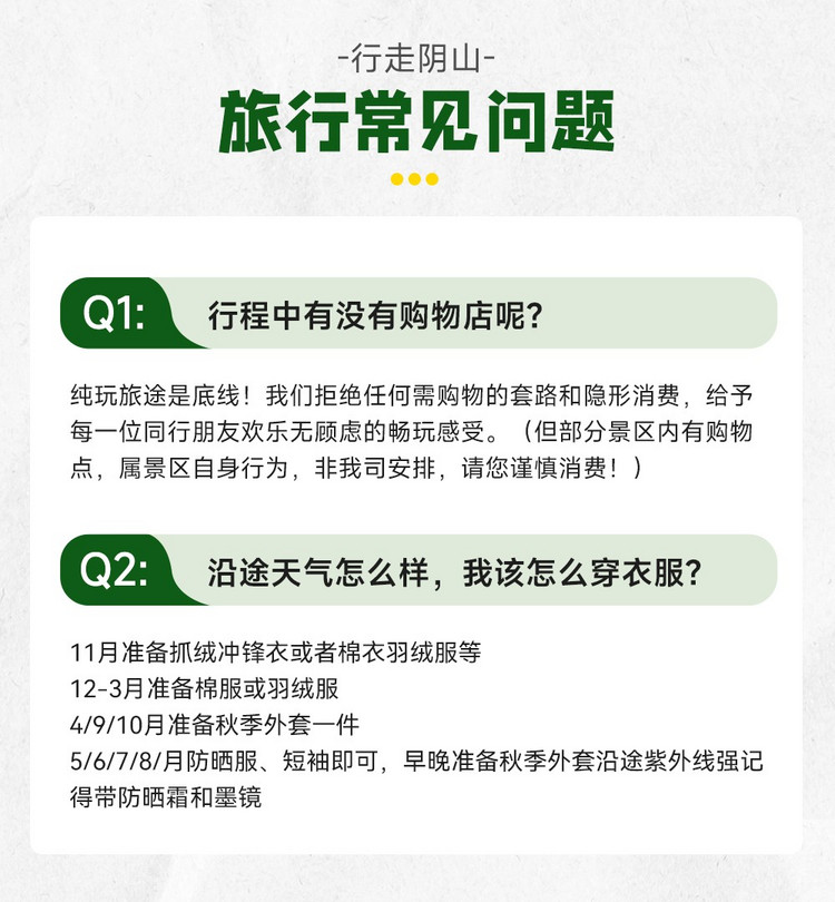 2、门票:行程中区域门目前暂无门票产生,如景区有调整,以实际执行为准;