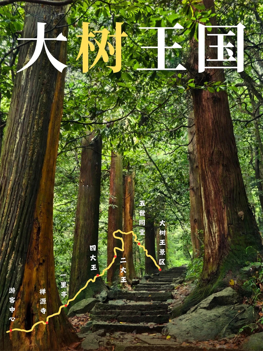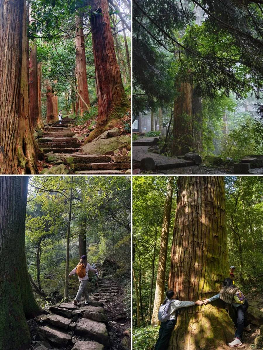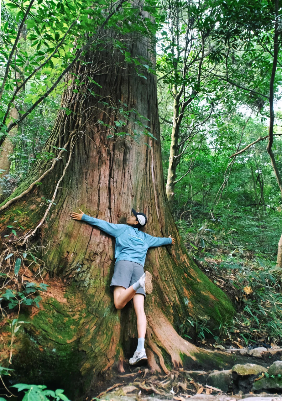 跟着领队我们先来到【源禅寺】,逛一逛这座山里的古寺。随后开始大树王景区徒步,原始森林既视感迎面扑来,整个眼界峰峦叠翠,古木葱茏,更附加奇岩怪石之险,有流泉飞瀑之胜,一副生态旅游胜地景象。远眺山峦,石多形奇,争相媲美,时不时还能听到流水声!大树王景区内大树参天,可以找到几人合抱的柳杉、直冲云霄的金钱松与五世同堂的古银杏,是名副其实的大树王国。随处可见参天巨树—柳杉树,浓郁的绿色,就像闯入了迷雾森林。在这里必做的事情就是抱树~一路爬,一路拍照~