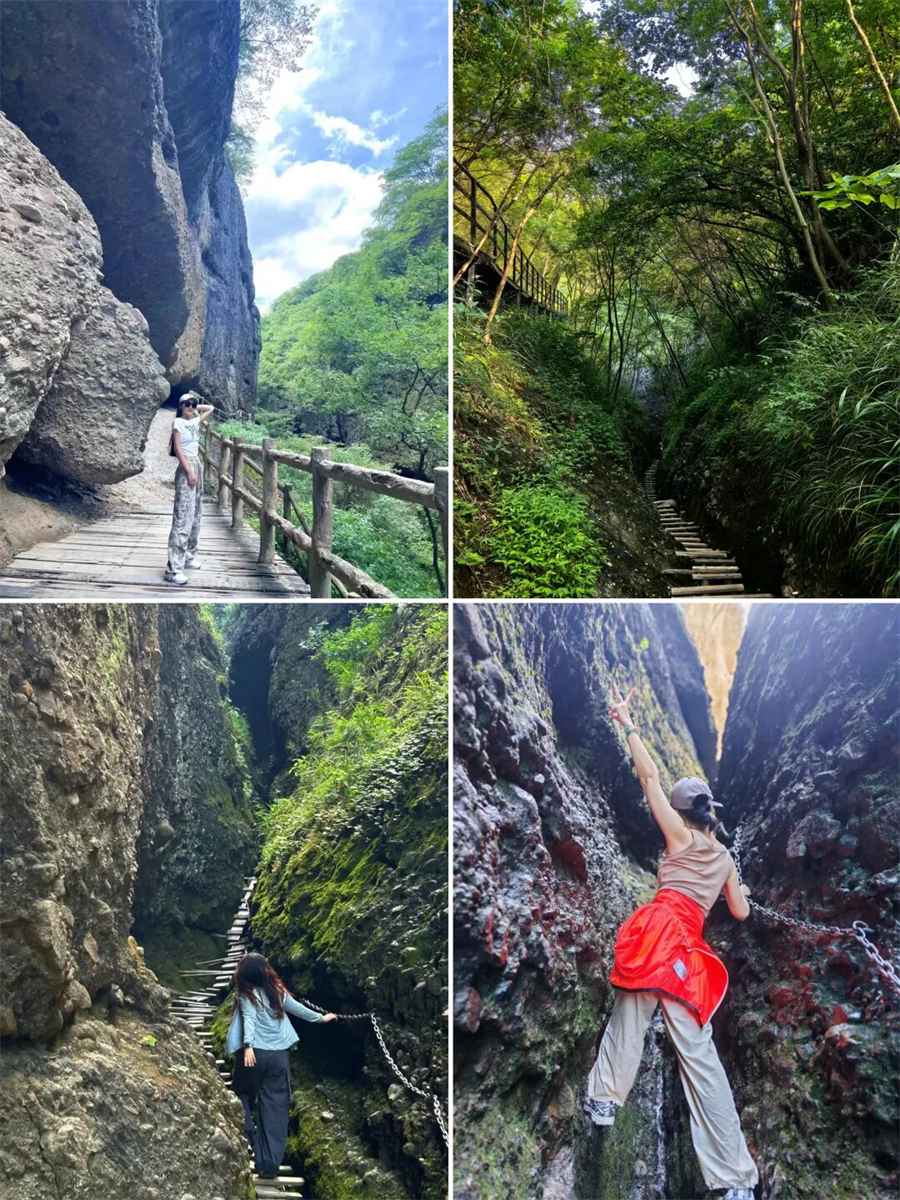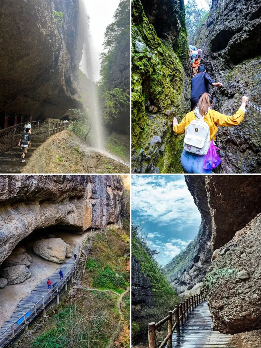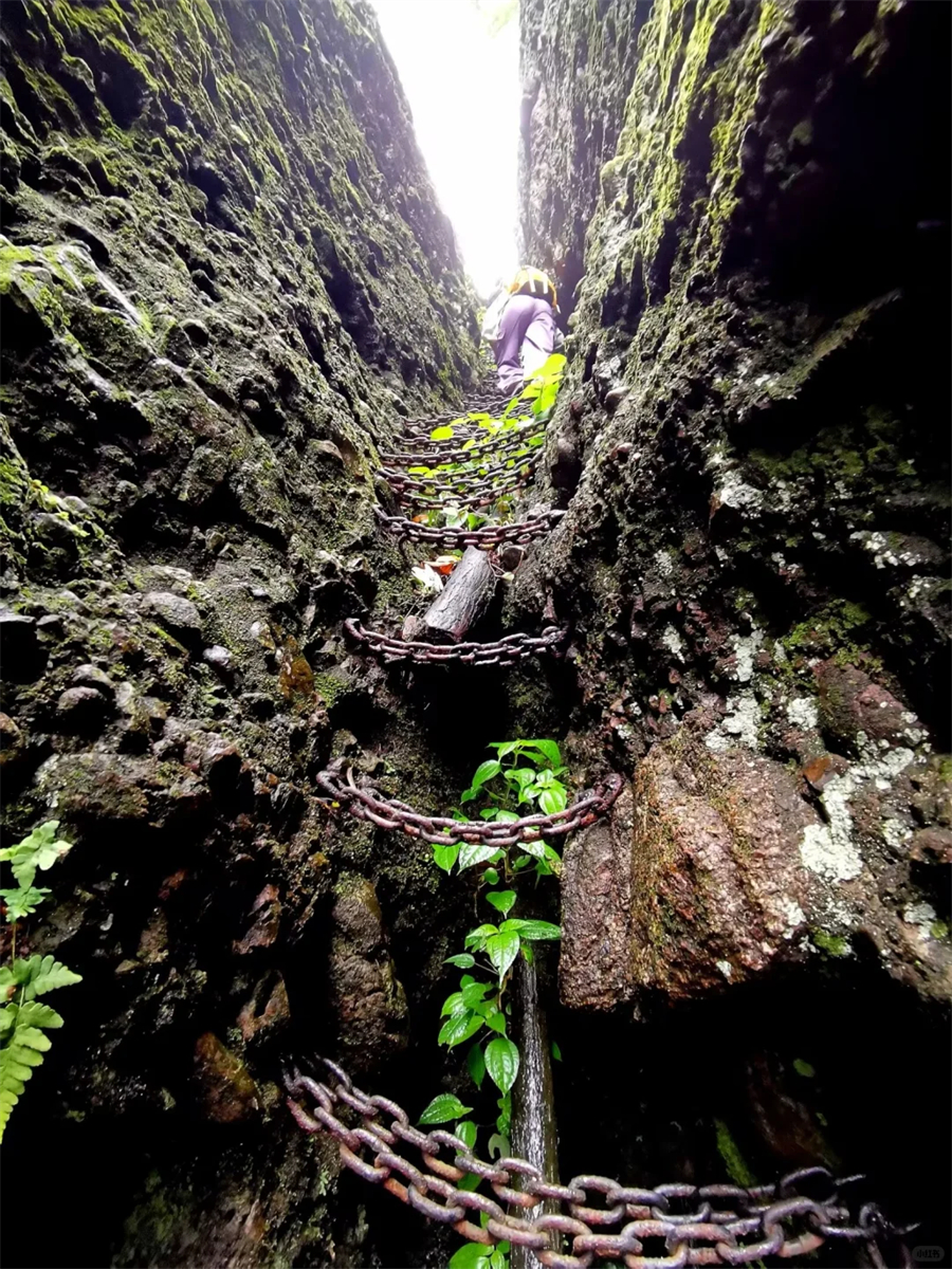 早餐后咱们集合前往【九峰十三洞】。【九峰十三洞】集峡谷地貌和洞穴景观于一体,韭菜沟、板墁沟、一线天以及观音洞、传贤洞、长岩洞、水洞等二十几处自然奇观在方圆十几公里范围内星罗棋布,交错纵横。其峡谷和洞穴是由地壳运动和水流数千年来长期的侵蚀所形成。韭菜沟应该是【九峰十三洞】中最险的一段了,大别山山脉在这里被从中横劈成两半,形成了一条狭长的"V"字形大裂谷,崖壁陡峭如刀砍斧削,最窄处仅容一人通过,需借助铁链攀爬陡坡,极具惊险刺激,景色原始且充满野趣。如果不想挑战韭菜沟,可以走旁边的板墁沟,很好走,沟内植被繁茂,两壁长满了青苔,风景迷人,炭窑遗址、旱洞和水洞,仿佛在狭缝中行走。