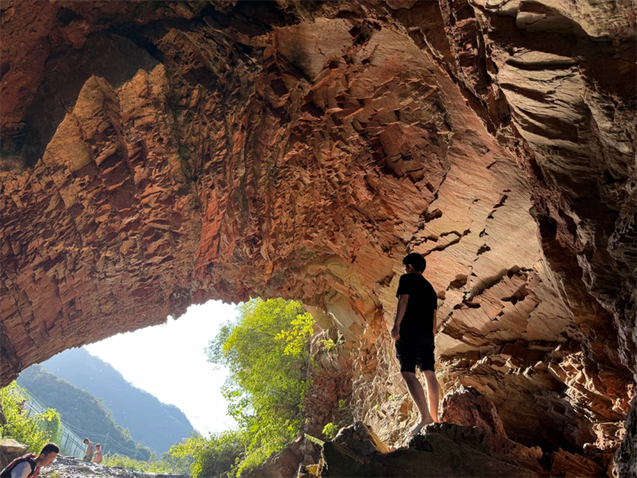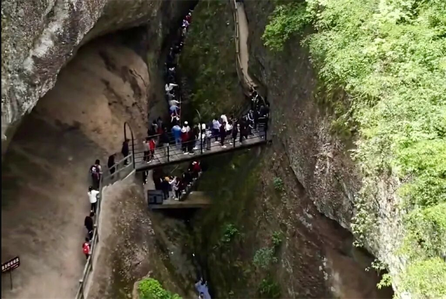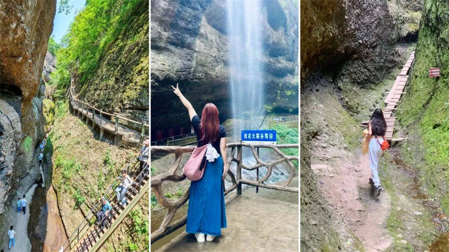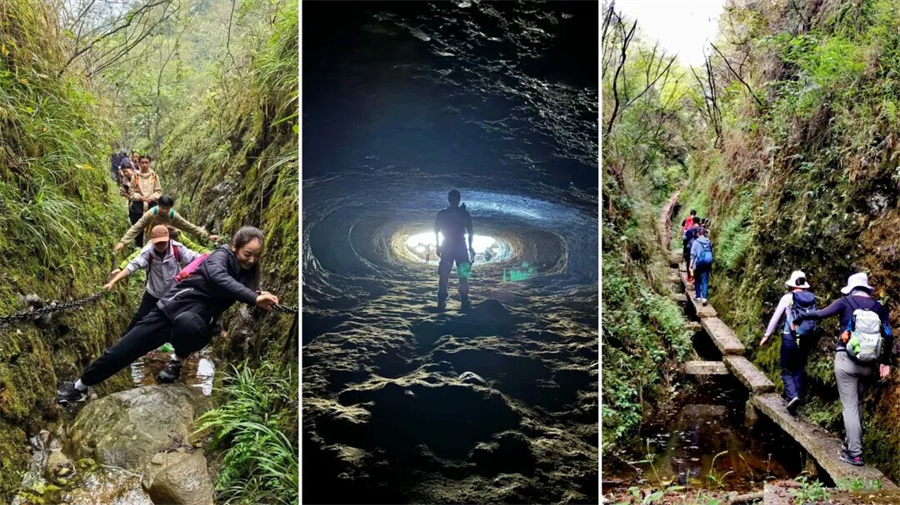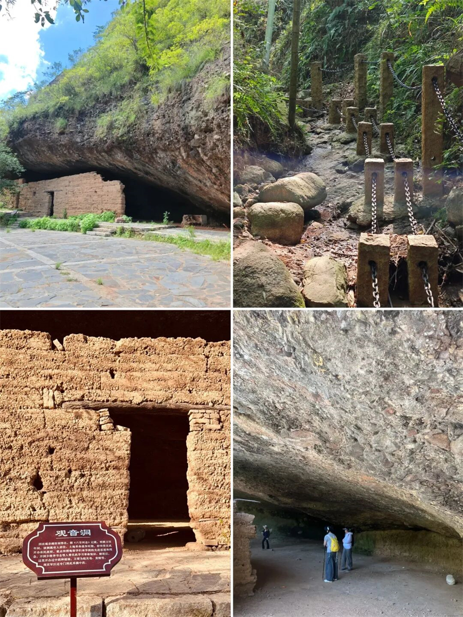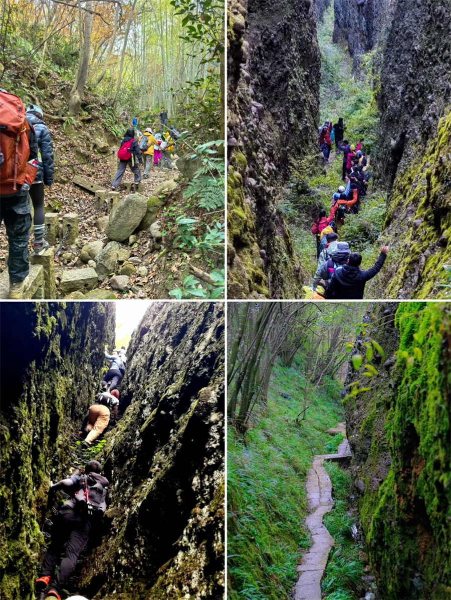 早餐后咱们集合前往【九峰十三洞】。【九峰十三洞】集峡谷地貌和洞穴景观于一体,韭菜沟、板墁沟、一线天以及观音洞、传贤洞、长岩洞、水洞等二十几处自然奇观在方圆十几公里范围内星罗棋布,交错纵横。其峡谷和洞穴是由地壳运动和水流数千年来长期的侵蚀所形成。韭菜沟应该是【九峰十三洞】中最险的一段了,大别山山脉在这里被从中横劈成两半,形成了一条狭长的"V"字形大裂谷,崖壁陡峭如刀砍斧削,最窄处仅容一人通过,需借助铁链攀爬陡坡,极具惊险刺激,景色原始且充满野趣。如果不想挑战韭菜沟,可以走旁边的板墁沟,很好走,沟内植被繁茂,两壁长满了青苔,风景迷人,炭窑遗址、旱洞和水洞,仿佛在狭缝中行走。