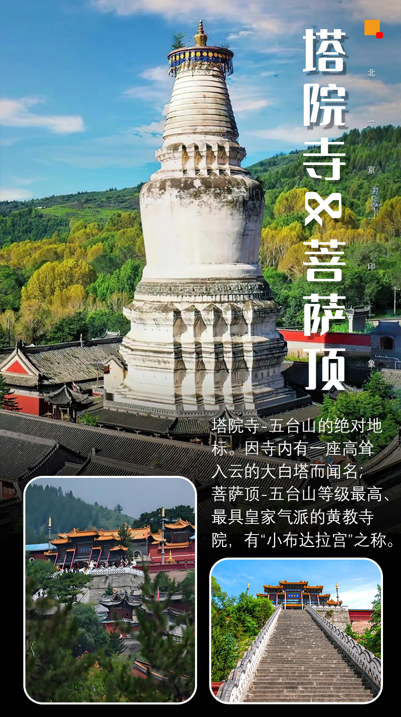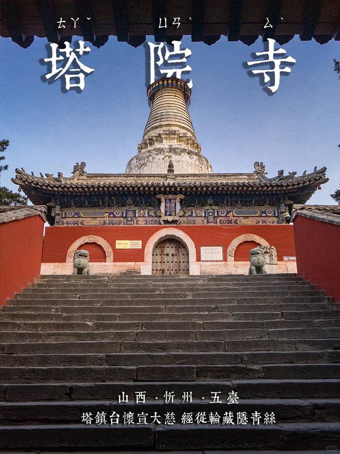 塔院寺(白塔寺)以大白塔为标志,高56.4米,内藏释迦牟尼舍利,白塔为元代尼泊尔匠师阿尼哥设计,信徒绕塔祈福,毛泽东1948年曾路居寺内方丈院。五台山寺庙群是宗教圣地,更是建筑、雕塑、文化的瑰宝,2009年被列为世界文化遗产。