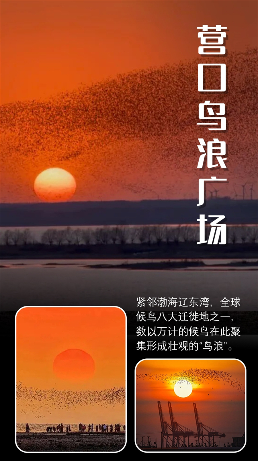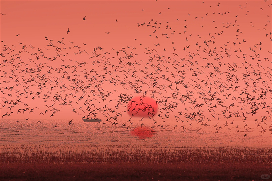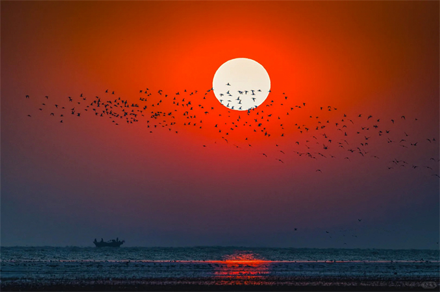 适时集合前往营口市。抵达营口后前往大河口湿地观看候鸟,夕阳坠海,在这里是中国大陆唯一能看到夕阳坠海+鸟浪同框的震撼场面。