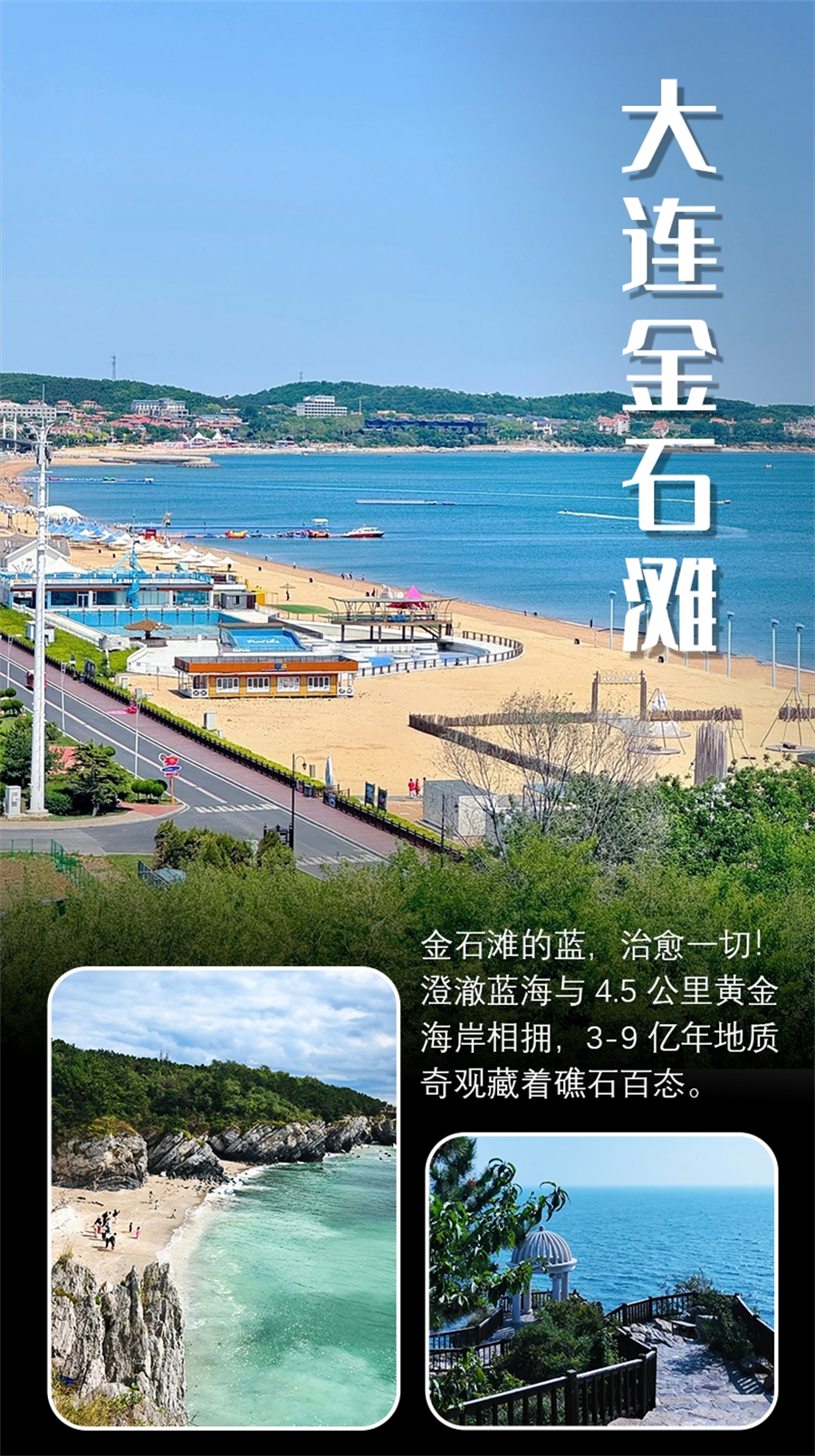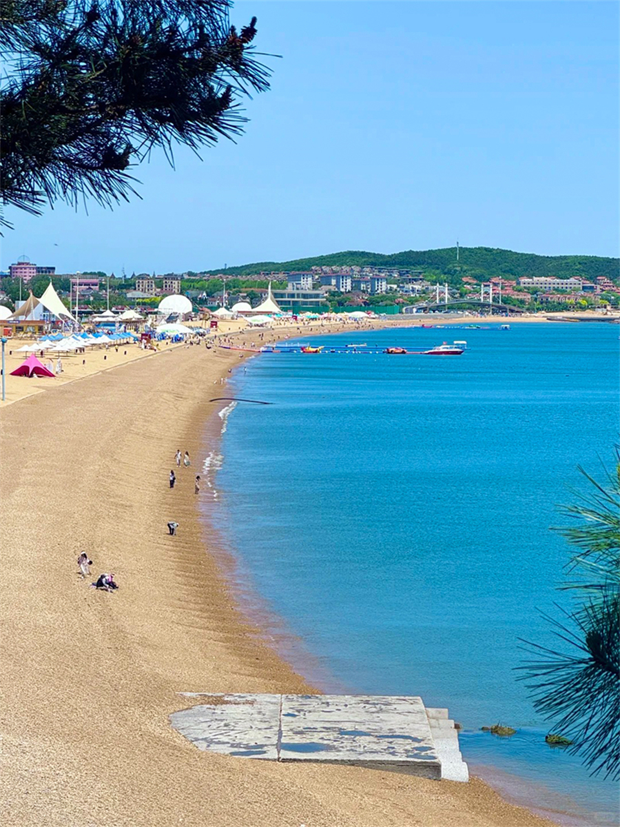 2、银沙滩,(约 1 小时)一个比星海广场人少很多的地方,超级出片:网红S弯公路(小镰仓风、礁石洞、跨海大桥同框),鹅卵沙滩、海水清澈 海浪声音好听,银沙滩紧挨着跨海大桥。