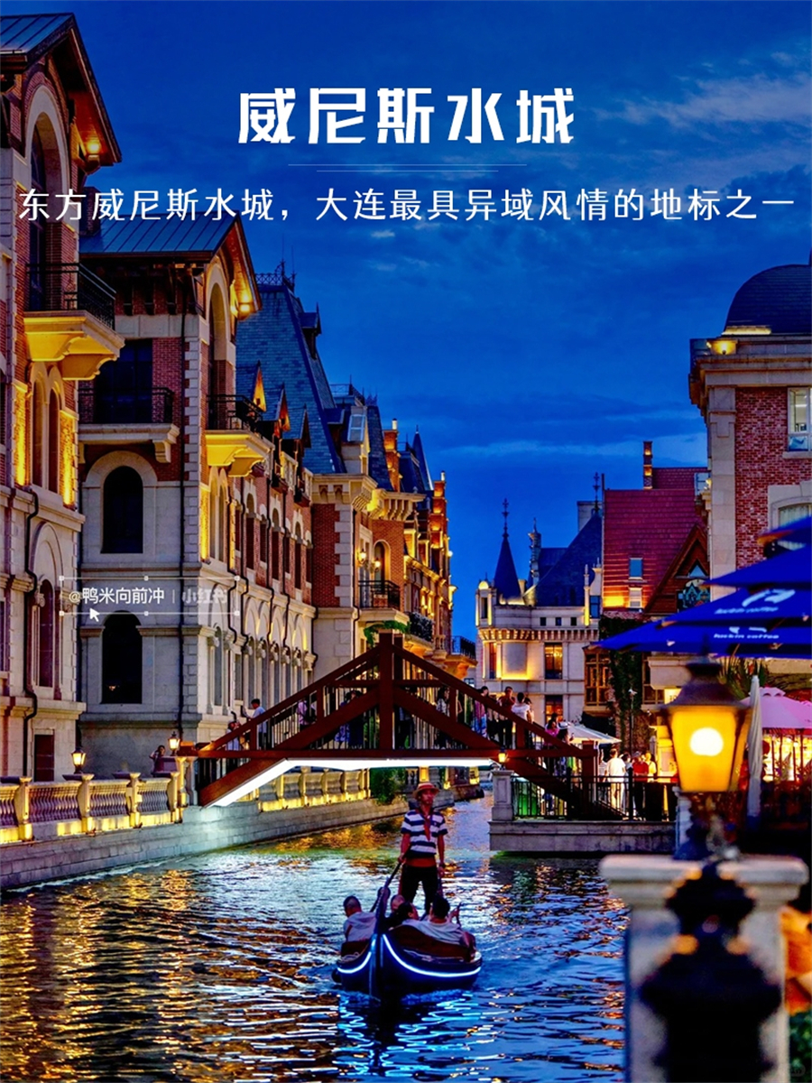位于大连东港商务区,以意大利威尼斯为蓝本,欧式城堡、拱桥、人工运河交错。白天可乘贡多拉游船穿梭水巷,夜晚华灯初上,建筑灯火倒映水中,浪漫梦幻。运河两岸有餐厅、酒吧、文创小店,适合漫步、拍照、品尝小吃,是大连必打卡的网红夜景地。