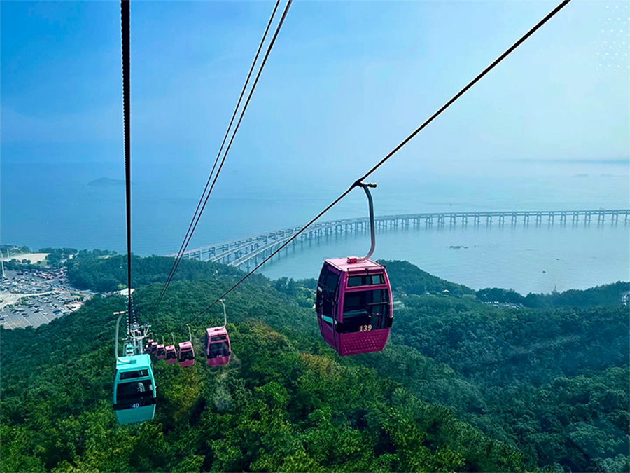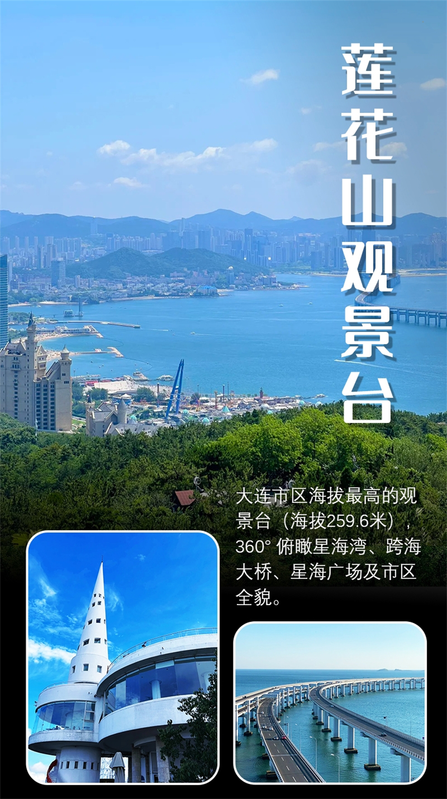 1、莲花山观景台(约 1 小时):大连市区制高点(海拔 259.6 米),360° 俯瞰星海湾、跨海大桥、星海广场及市区全貌。可徒步或乘索道上山,山顶观景台视野极佳,日出日落时分光影绝美。,在这里可以俯瞰跨海大桥全景。