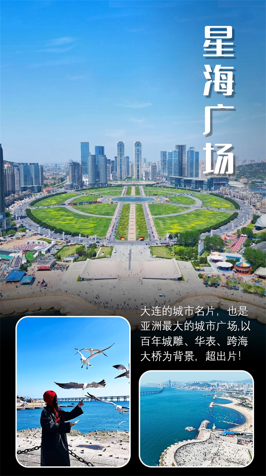 4. 星海广场(约 2 小时):亚洲最大城市广场,面朝大海,中央有巨型华表与百年城雕。可喂鸽子、漫步海边、午餐在这里