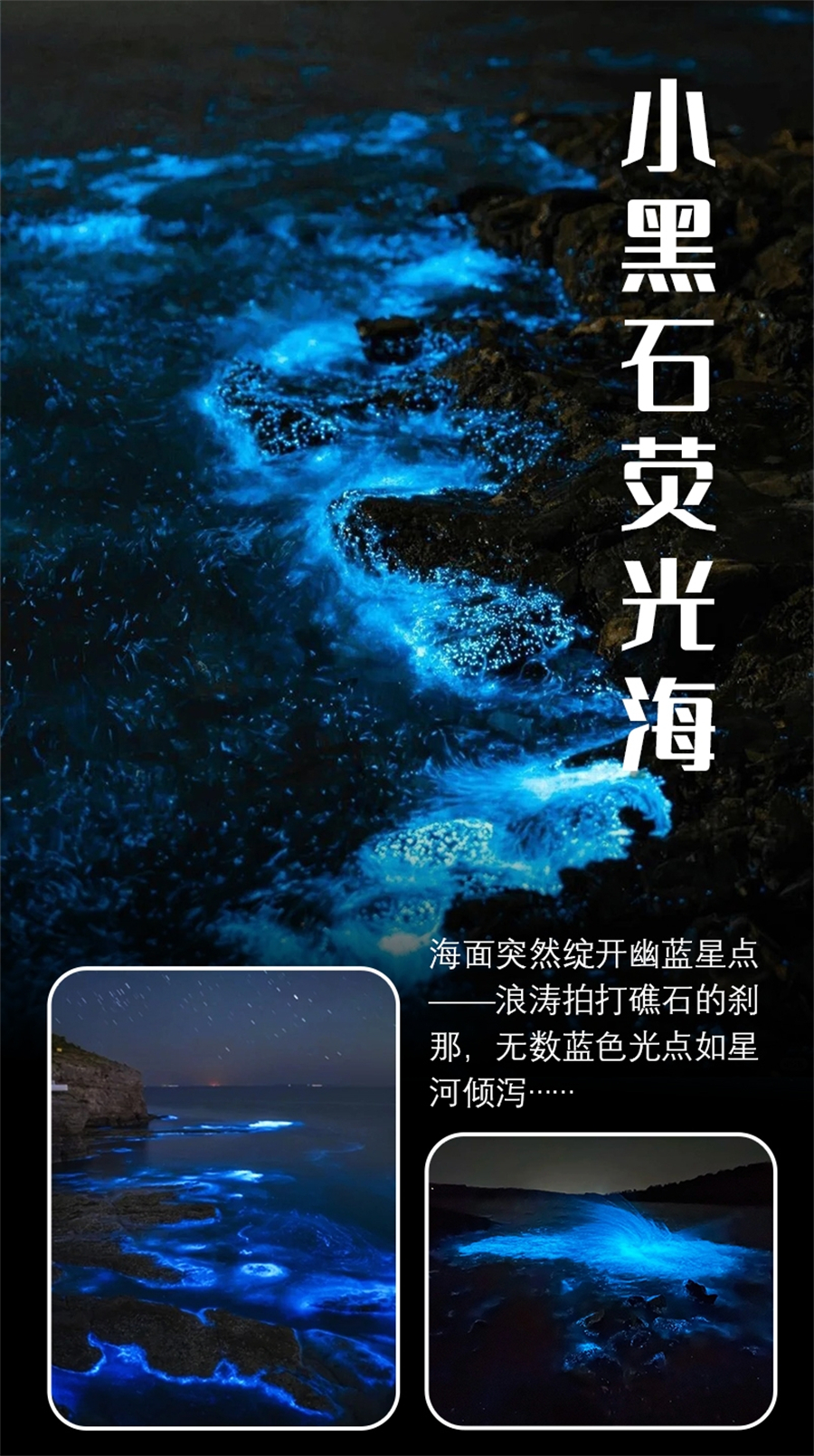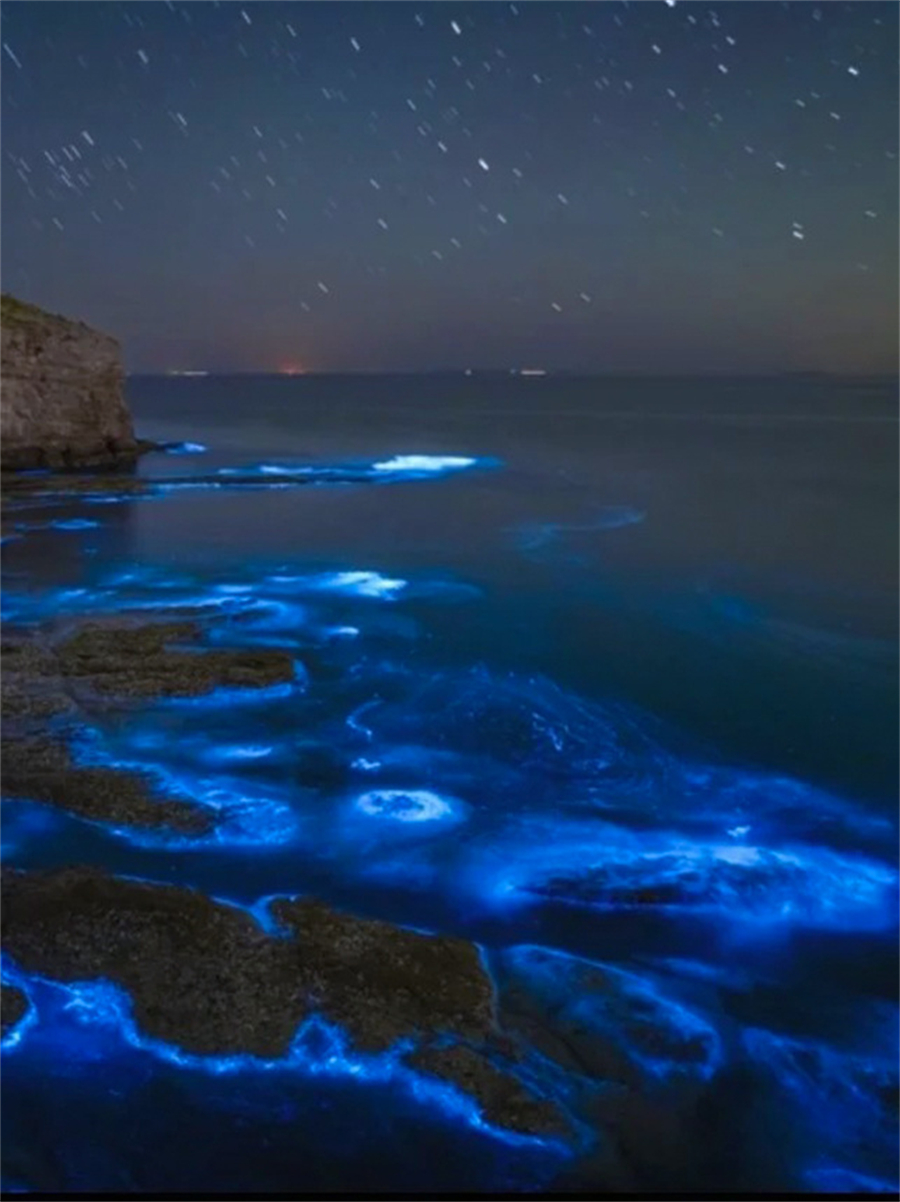 蓝眼泪为浮游生物发光现象,受水温、潮汐、天气影响,出现概率不定。海边礁石错落,夜色中蓝光闪烁,浪漫神秘,是大连独特的自然奇观与网红秘境。