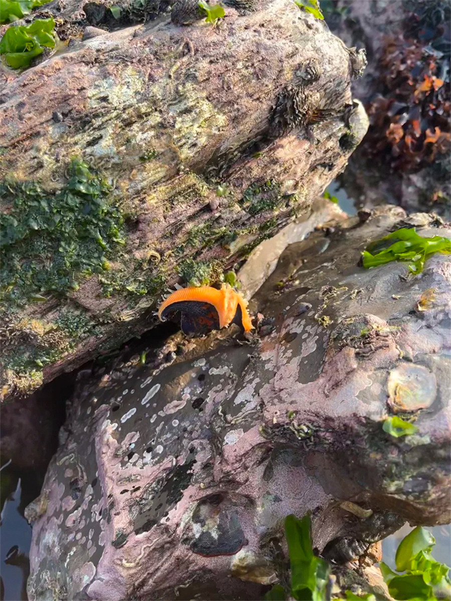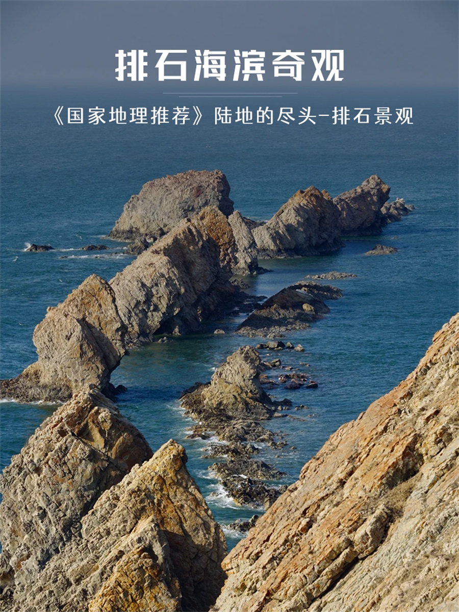 4.排石礁群(约 2 小时):一排礁石呈扇面深入海中,延伸超 1 公里,形如哥斯拉尾巴或巨龙鳞片,退潮时显露壮观 。驼山石壁,高约 20 米,岩层叠压似经卷摊开,夕阳下泛金光。象形石与海蚀洞包含“石猴观潮”、“渔翁出海”等奇石,部分崖壁有上下贯通的海蚀洞,潮水涌动时景色独特 这里也是观看日落和夕阳的好地方。这里也是国家地理推荐的大连三个地点之一,另外两个是金石滩和长海县。