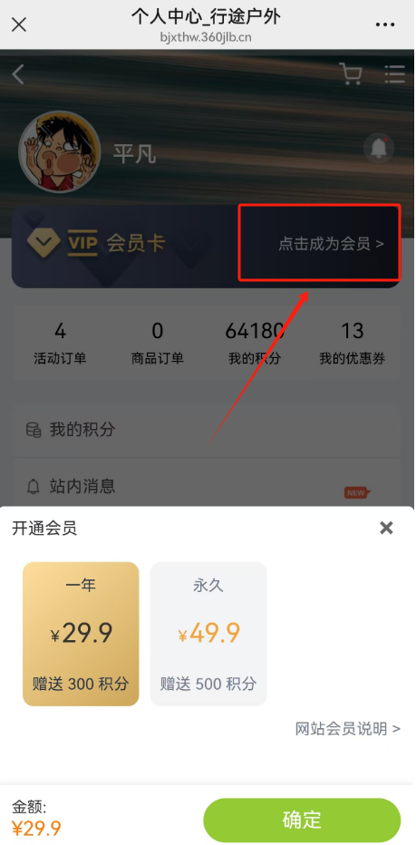 ② 方法二:进入用户自己的个人中心,点击顶部头像旁边的会员升级链接,升级成为网站会员;
