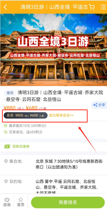 ① 报名参加户外活动时,可以享受会员价,会员价要比正常售价低很多,并且无任何活动和人数限制,可选择成为年费会员或者永久会员;