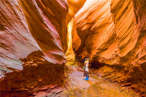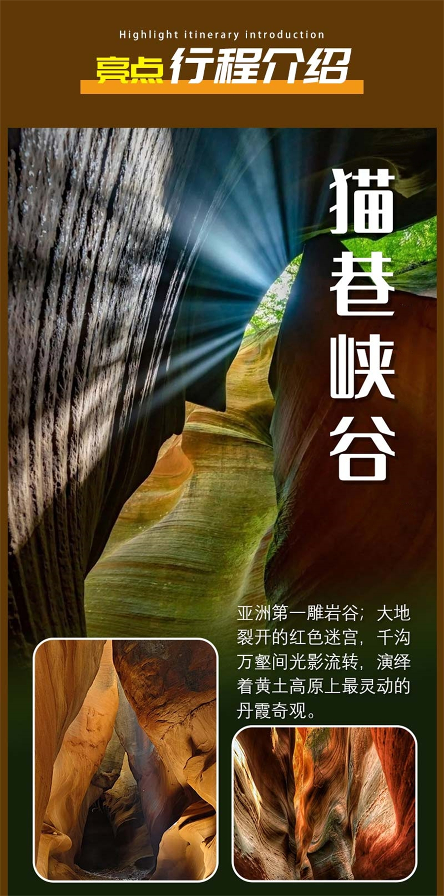 适时集合前往志丹县,乘坐摆渡车前往陕北版的羚羊大峡谷——【猫巷大峡谷】游览,抵达后游览峡谷丹霞奇妙美景、领略亿万年形成的神奇地貌。让我们知道不单单美国的羚羊大峡谷举世闻名,在我们中国的一个小小乡村里同样隐藏着逆天的自然神奇杰作,同样令人叹为观止。并且目前仍旧保持着最原始未被开发的原貌。峡谷内由乾坤谷、恋人峡谷(绝情谷)、宫殿走廊、似水流年壁、塑身巷、别有洞天六个景点组成,景区山水如画,景色宜人。峡谷和曲壁是其必备的两大特征,是永久性或季节性湍急流水携带砂砾等沉积物对岩石中先存的构造薄弱部位长期冲刷、刻饰、磨蚀而成的无数壶穴在三维空间中贯通形成的。猫巷峡谷长达9公里,深浅不一,最窄处仅容一个人通过,形成巨龙环绕的多处一线天景观,谷壁流水曲线如棕红色巧克力般丝滑柔顺,婉转而变化万千。