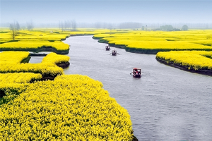 兴化千岛垛田油菜花景区的自然地貌如垛一般,风景区里港汊密集,河如阡陌。每年四月,小垛处处开满了金灿灿的油菜花,更有另一番浪漫光景,万亩油菜花海如漂浮于水中,云蒸霞蔚,水漾花娇,如梦如幻,在水面构织出一片片“金色花海”,煞是壮观!乘坐着小船,人们置身于一望无际的千岛菜花间,感受随风而来的醉人菜花香,有心旷神怡之感,美不胜收之慨。