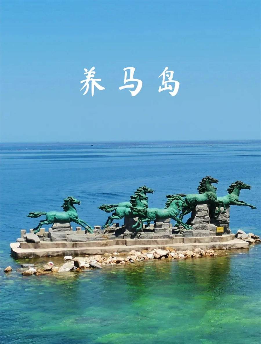 养马岛相传秦始皇东巡时在此饲养御马,并封为“皇家养马岛”,故而得此名。岛上有天马广场、赛马场、海滨浴场、海上世界、御笔苑等娱乐景点。大家可以自行租自行车/乘坐岛上摆渡车游览。