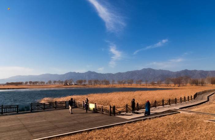 这里也是华北地区最大的湿地公园。水草芦苇丰茂,风吹过的时候,非常漂亮,公园沿途有亲水木站台,鸟岛,湿地观景台,望湖楼,西保护站,观鹤台,湿地百草原等特色景点。
