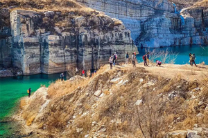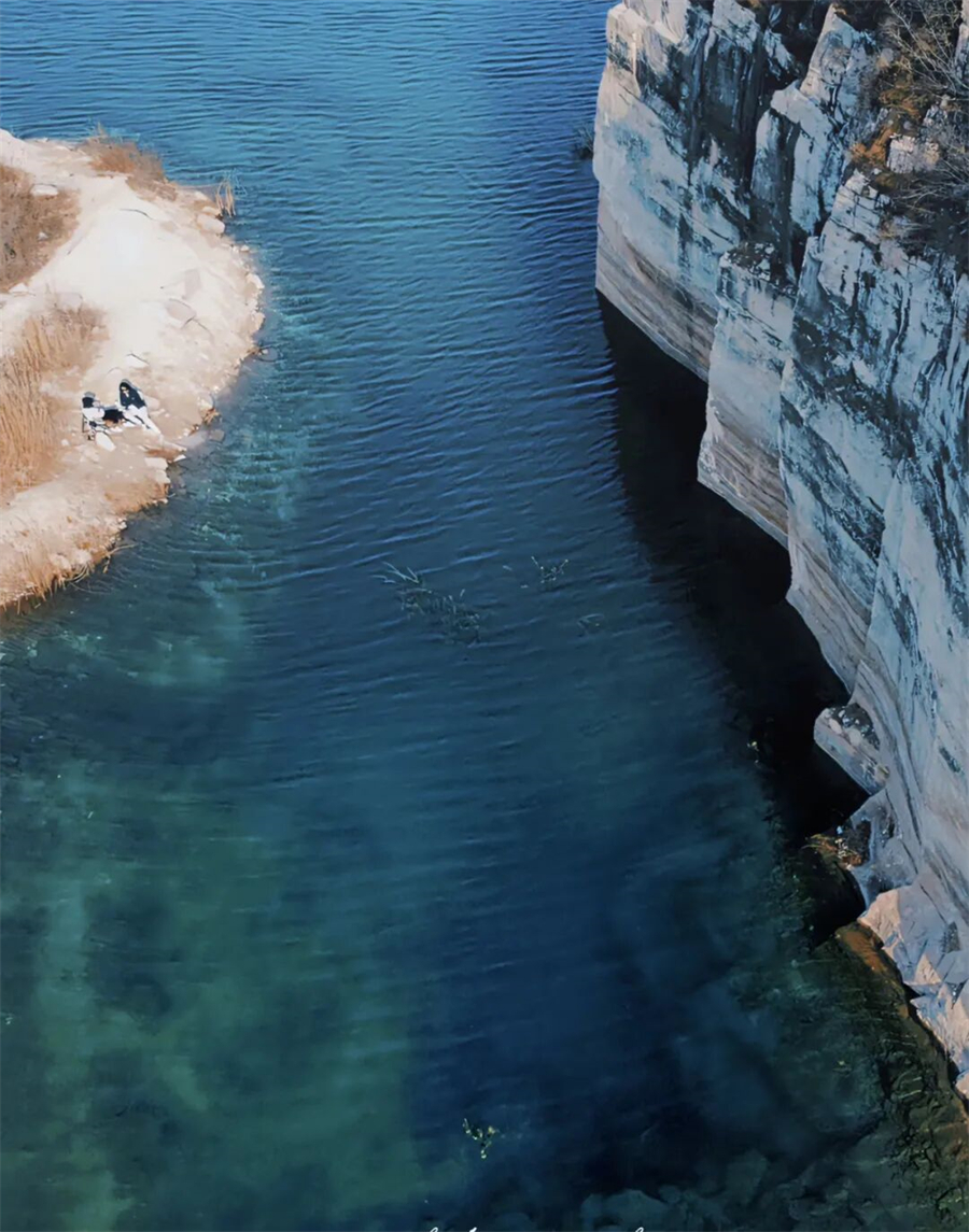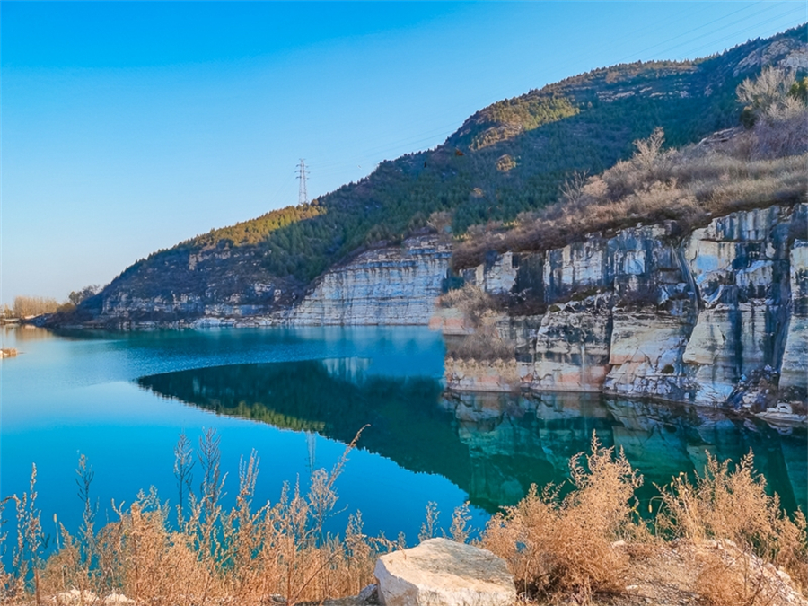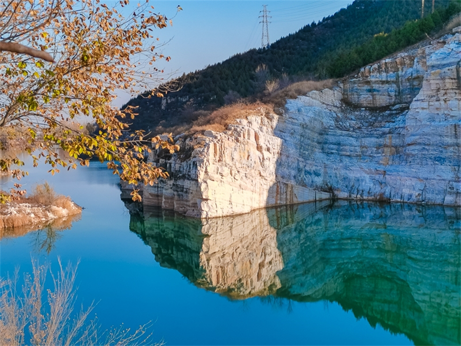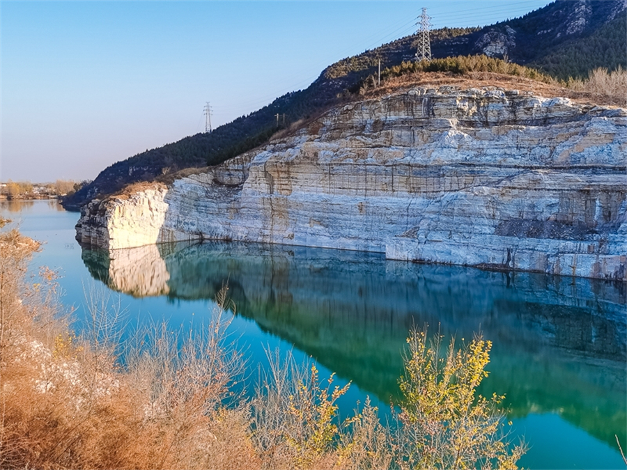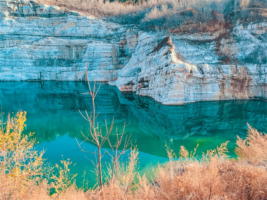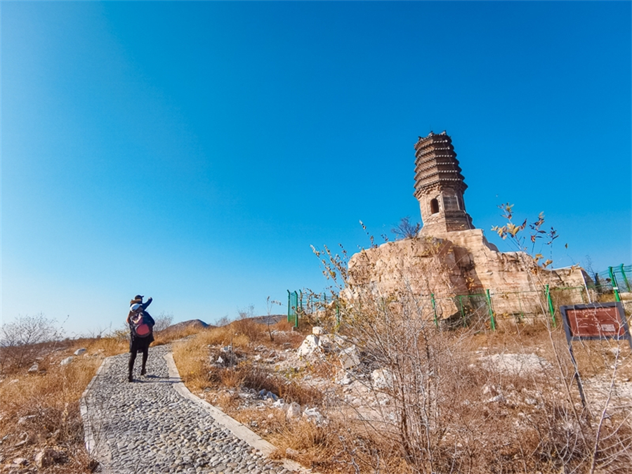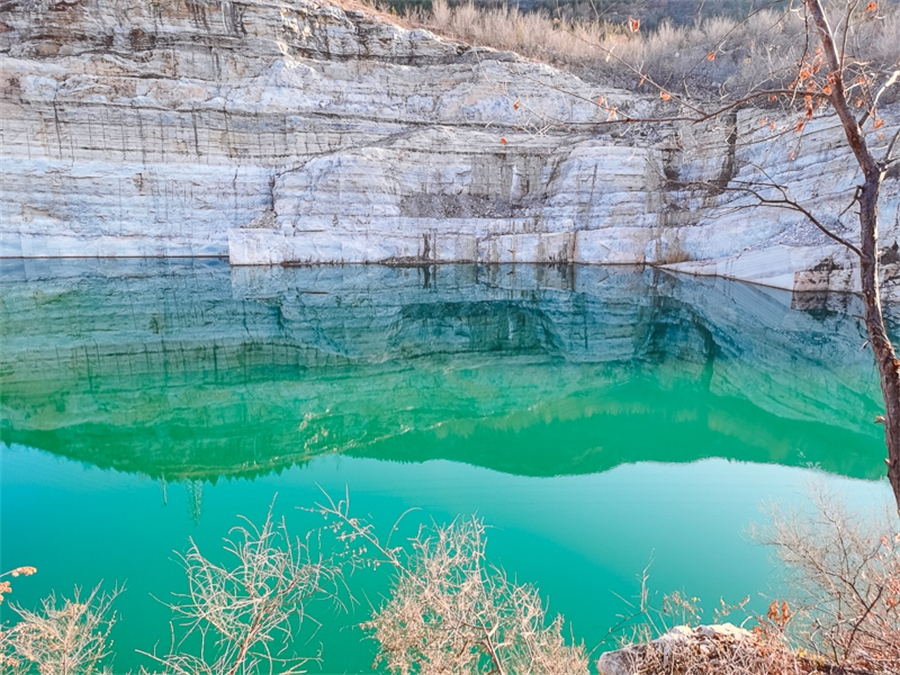 10:30|到达徒步起点,在领队带领下徒步前往翡翠湖。翡翠湖原来是有七眼泉,汉白玉之所以通体洁白无瑕、质地莹润细腻,是因为千百万年来,它都泡在水里。而随着大型无节制的开采,七眼泉中的五眼随之都干涸了,在矿区封停后不久,已经干涸的泉水又开始流淌出清泉,才有今日的翡翠湖美景!距离矿坑不远,在村北的山坡上有一座古塔,该塔建于辽代,坐北朝南,为八角七级密檐砖塔,通高15米。