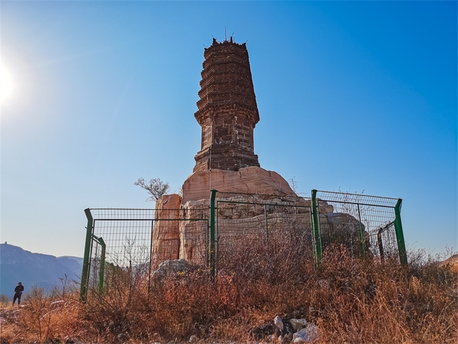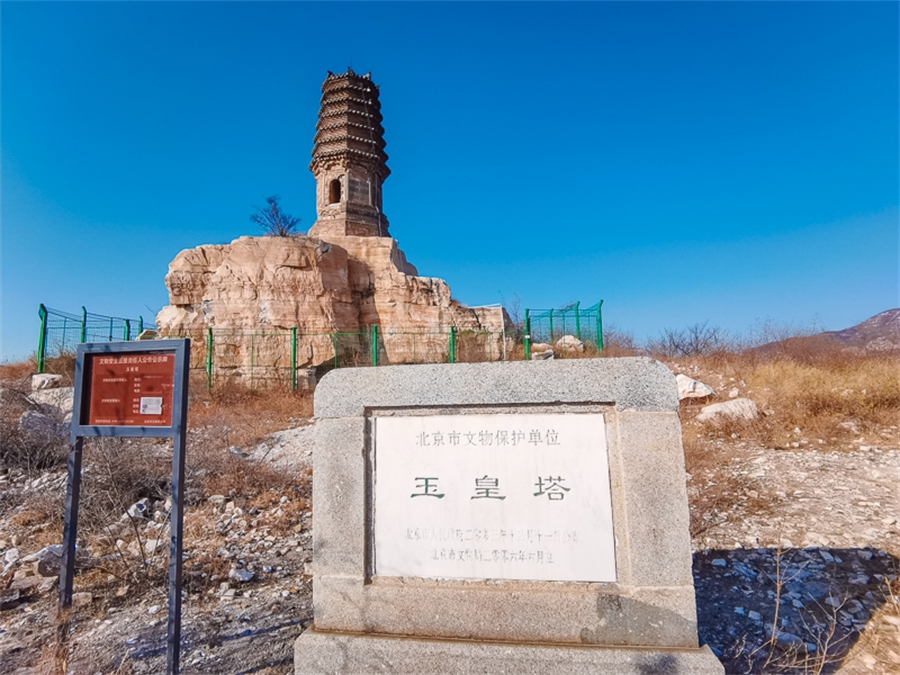 距离矿坑不远,在村北的山坡上有一座古塔,该塔建于辽代,坐北朝南,为八角七级密檐砖塔,通高15米。因塔内曾供奉玉皇大帝像,故名玉皇塔。塔身上承七级密檐式,塔顶八角攒尖,八条顶脊自顶端的封顶铁制宝珠向八方延伸,尽头有垂兽、套兽。