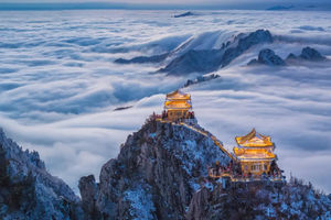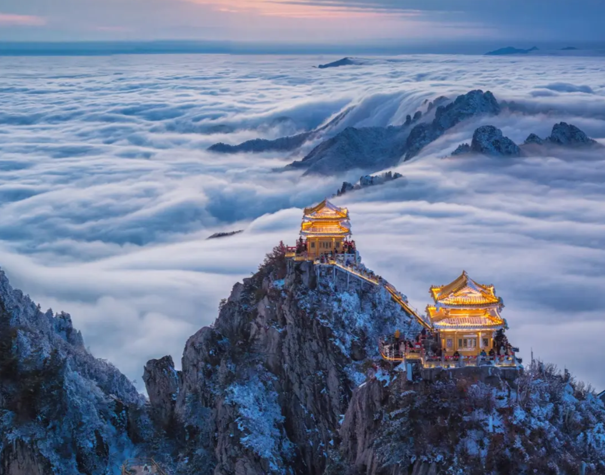 冬雪与松、石、云巧妙结合,配以晶莹冰挂、琉璃雾凇、宏伟金殿,将老君山装扮成绝美的人间仙境。