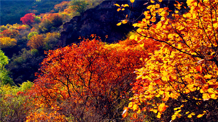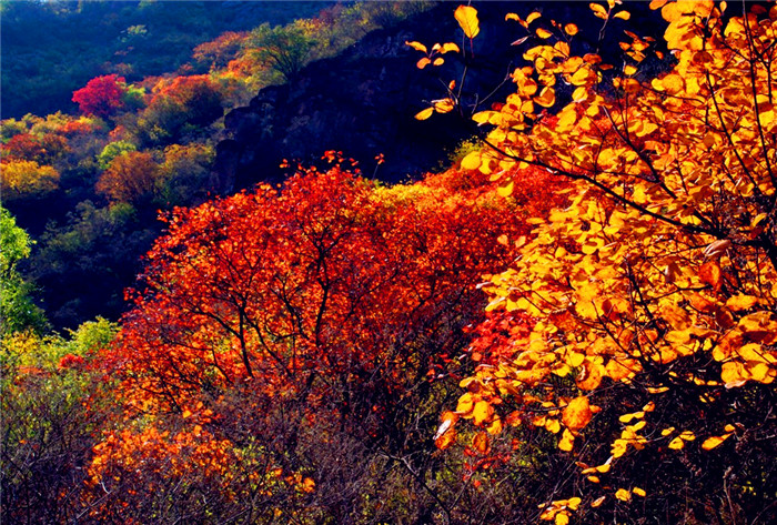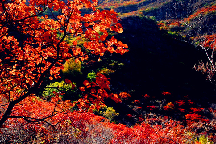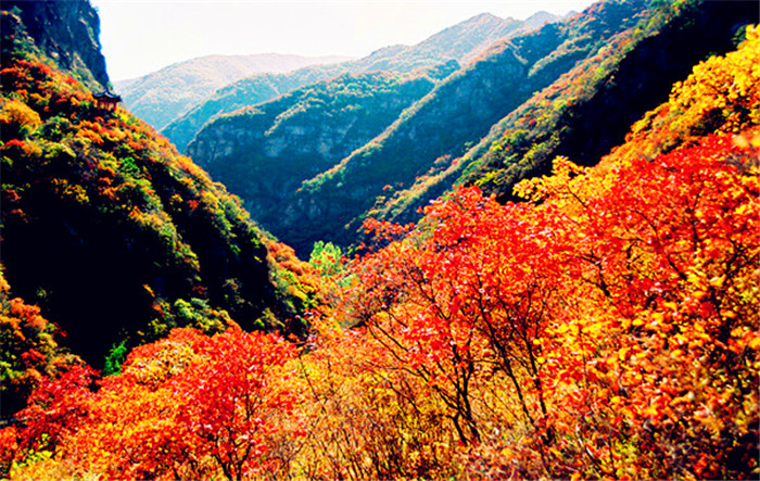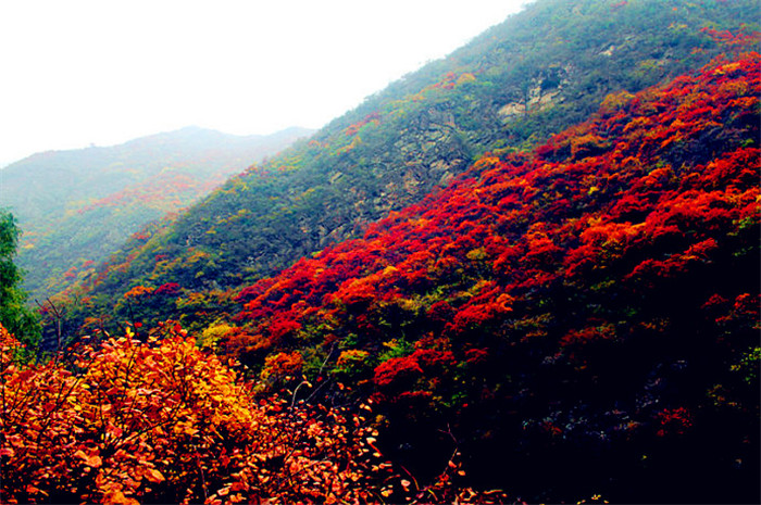 天高云淡、秋风送爽的天气,是观赏红叶的最佳时刻。树上的每一片叶子都红了,红红的脉络,红红的斑纹,红红的叶瓣,红得透明,红得深沉,红得壮丽,红得光 彩照人,红得火苗般的热情。站在高处眺望,近前黄栌火海荡漾,远方树林泛黄,边角处仍现翠绿。鬼斧神工的勾画出一副“人在画中游”的绝妙彩墨画。