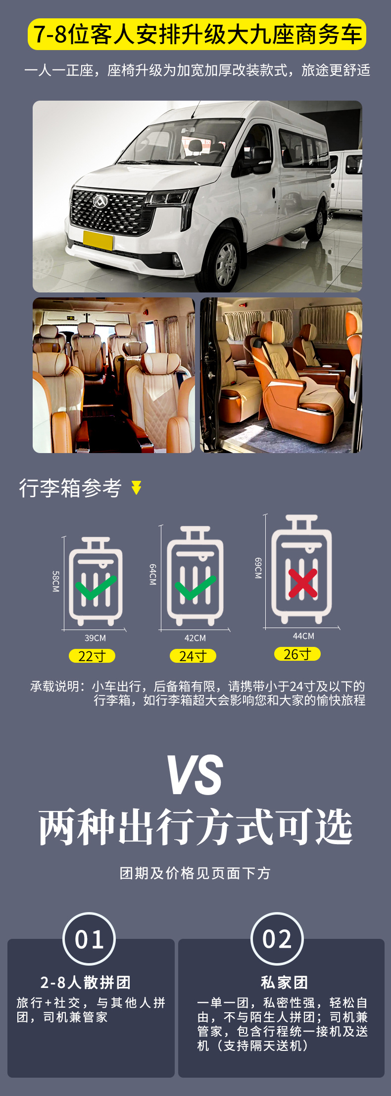 3、用车:2-3客人用5座SUV,4-5客人用7座商务车,6客人用9座商务车,7-8客人用大九座商务车,根据人数安排用车大小,不指定用车(小团副驾驶及前后座位置需要轮流乘坐,望悉知)