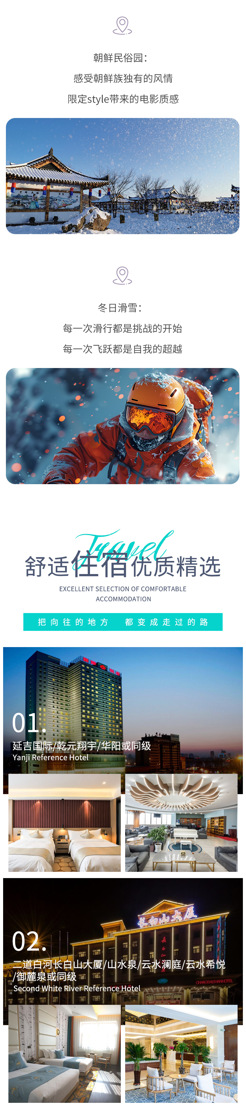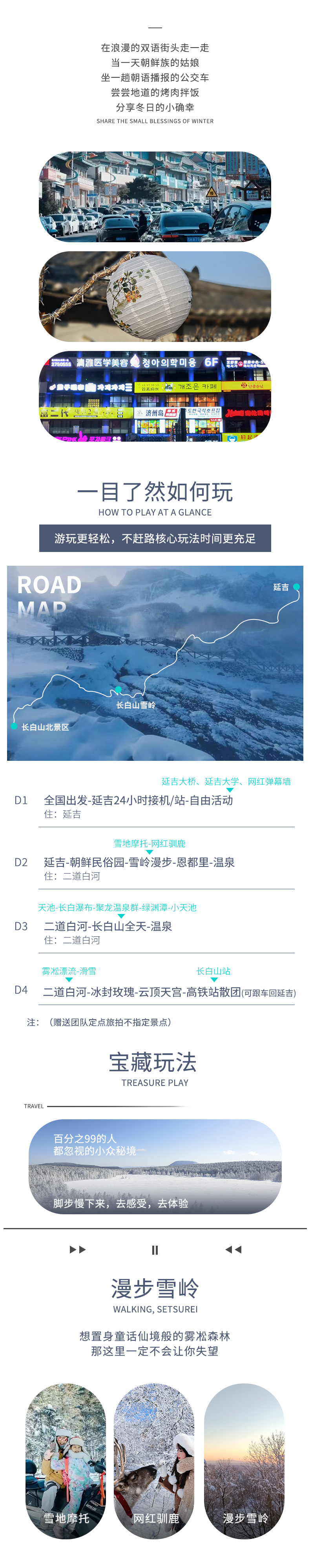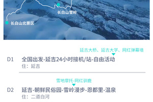 延吉-朝鲜民俗园-雪岭漫步(117KM,车程约2.5小时)-雪地摩托-网红驯鹿-恩都里-二道白河(62KM,车程约1.5小时)