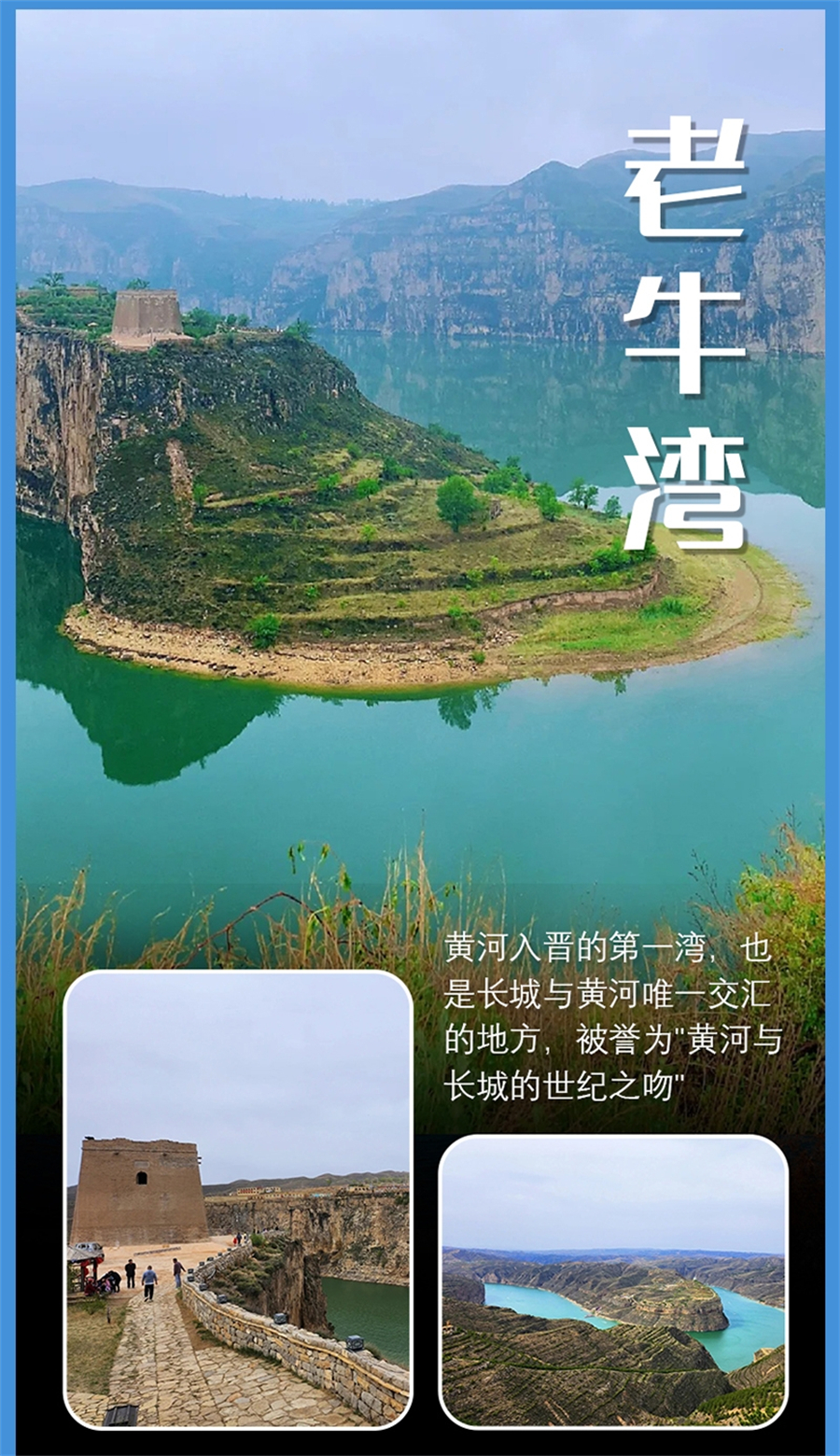 之后游览内蒙古老牛湾,这里是黄河与长城交汇的奇迹之地,以其壮美的自然景观和深厚的历史底蕴著称。这里,黄河蜿蜒流转,长城蜿蜒盘旋,共同绘制出一幅动人的山河画卷。