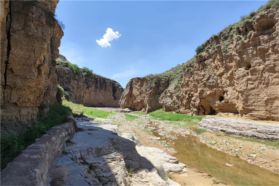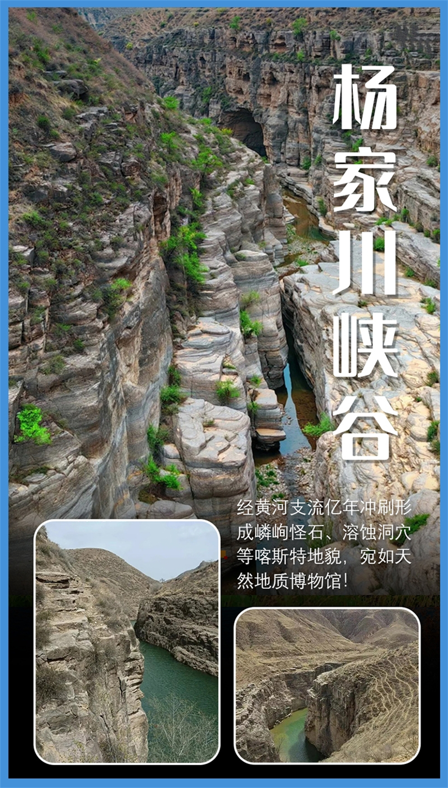 杨家川峡谷自然景观秀丽优美,峡谷深幽,两岸石壁嶙峋崎岖,曲折凹凸,如同大自然形成的工艺品或巨大盆景,自成奇观。峡谷深涧处溪瀑淙淙,碧水清澈。瀑布底端的水潭冲刷得最深,俗称蓝眼圪洞、蓝眼泉,因幽深发蓝像一只眼睛而得名,为峡谷增添着神秘。全程徒步约10公里,爬升约300米。峡谷深处,山泉潺潺,长城古堡点缀其间,构成了一幅动人的自然画卷,让人赞叹大自然的壮丽与神秘。