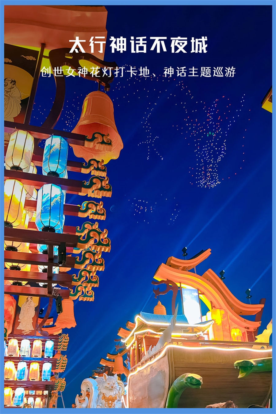“太行神话不夜城”是长治欢乐太行谷重点升级打造的项目,占地约16800平方米,主要由祈福广场、不夜城主街区、忘川神话美食街、创世女神花灯“打卡地”、神话主题巡游区、民俗社火巡游区等区域构成。