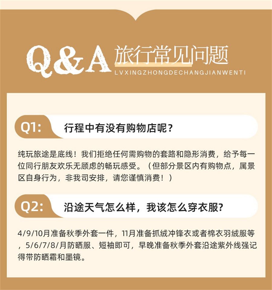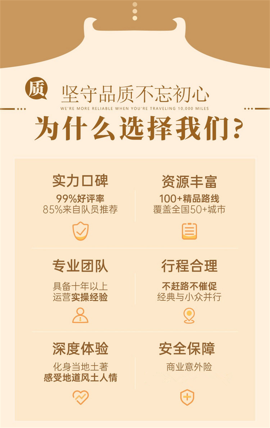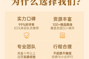 3、成团说明:如因参团人数未达到发团人数则取消当期活动,活动出行前提前通知并全额退款,积极为游客推荐类似路线或拼团。