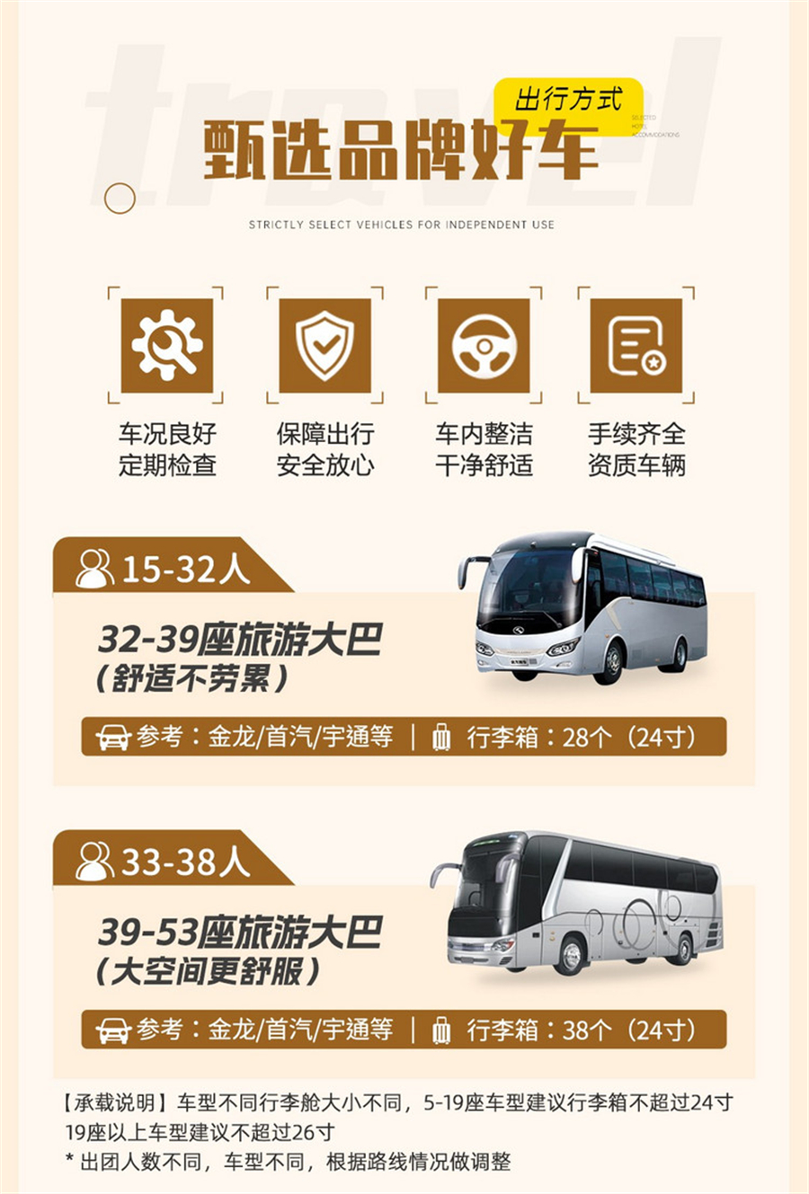 2、车上座位顺序为集合时先到的先坐,发车之后保持原车原座(有老年人、晕车等情况的领队将酌情调整);