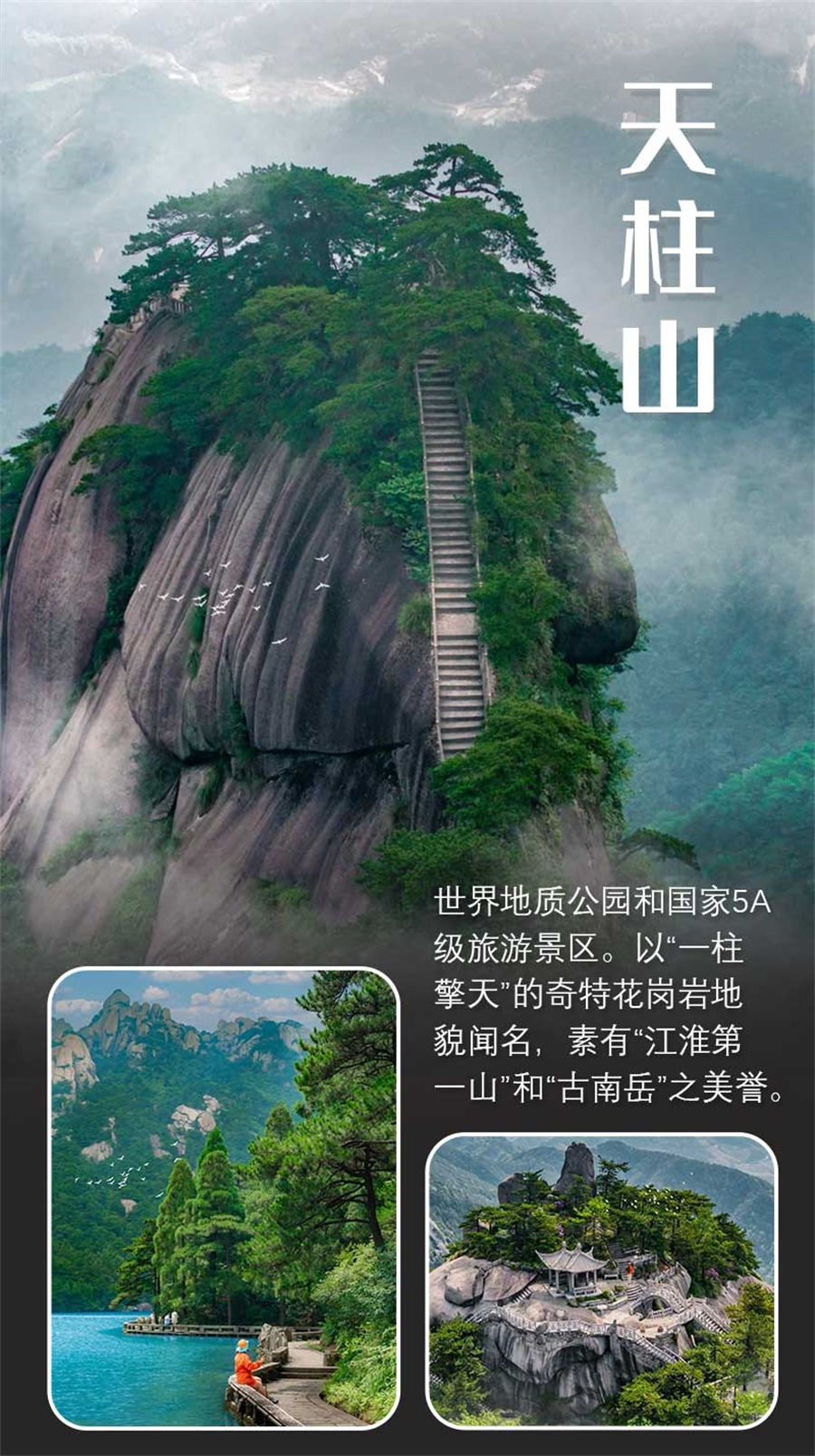 天柱山,如柱擎天,天柱山以郯庐断裂带上醉美花岗岩地貌闻名于世,尤以崩塌堆垒地貌,成为全国同类景观代表而赢得“天柱山型”花岗岩地貌的冠名美誉,自然风光雄奇灵秀,是文人墨客云集之地,如白居易、李白、王安石、苏轼、朱熹等都曾游历此地并留下赞美的诗篇。这是以花岗岩峰丛地貌为主的世界地质公园和国家5A级旅游景区,以“峰雄、石奇、洞幽、水秀”著称,拥有神秘谷、炼丹湖等景观,并留存有深厚的历史文化遗迹。