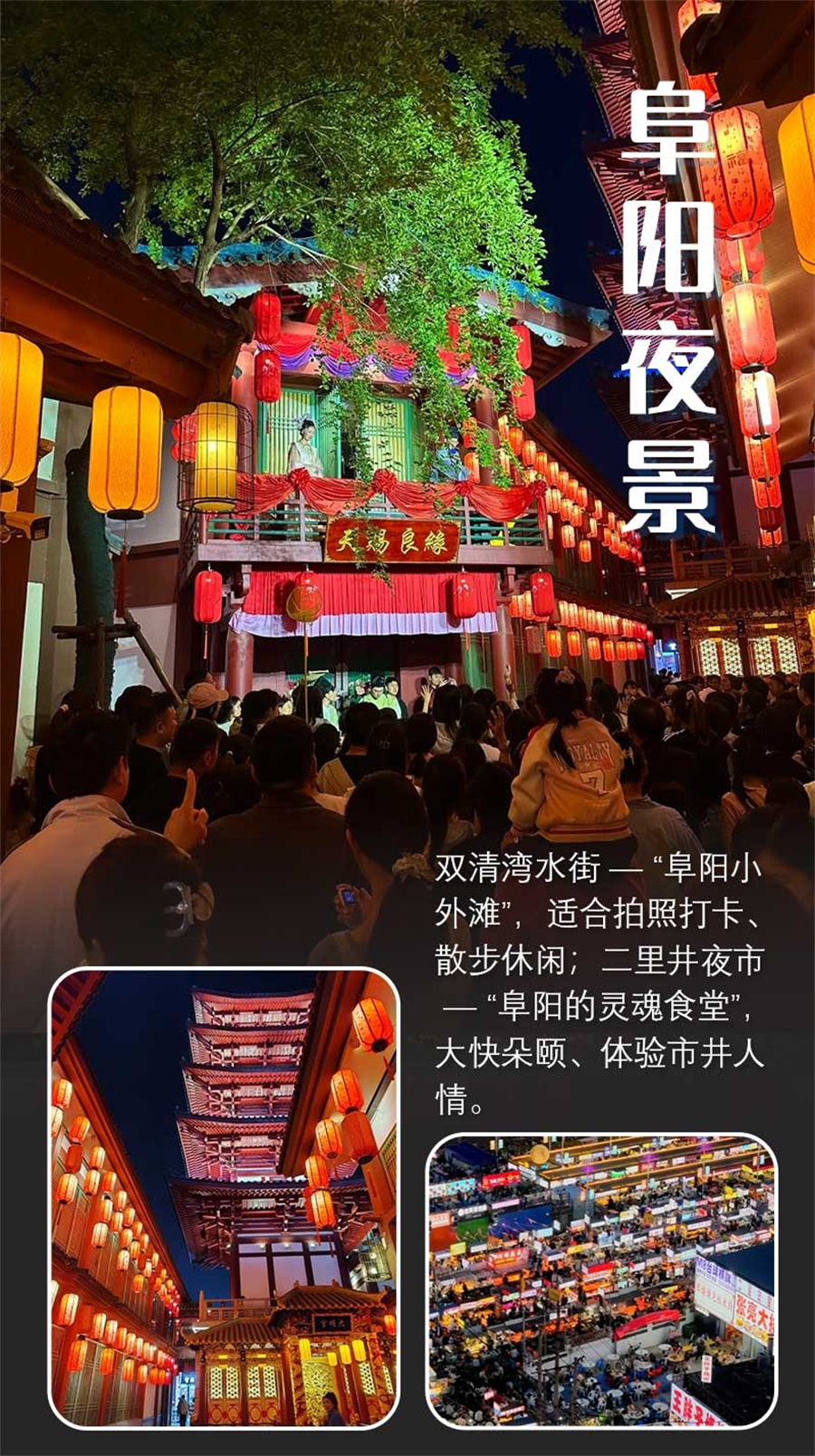 下午全体下山之后,我们前往阜阳安排住宿。之后可以自由结伴游览双清湾水街、二里井夜市等……